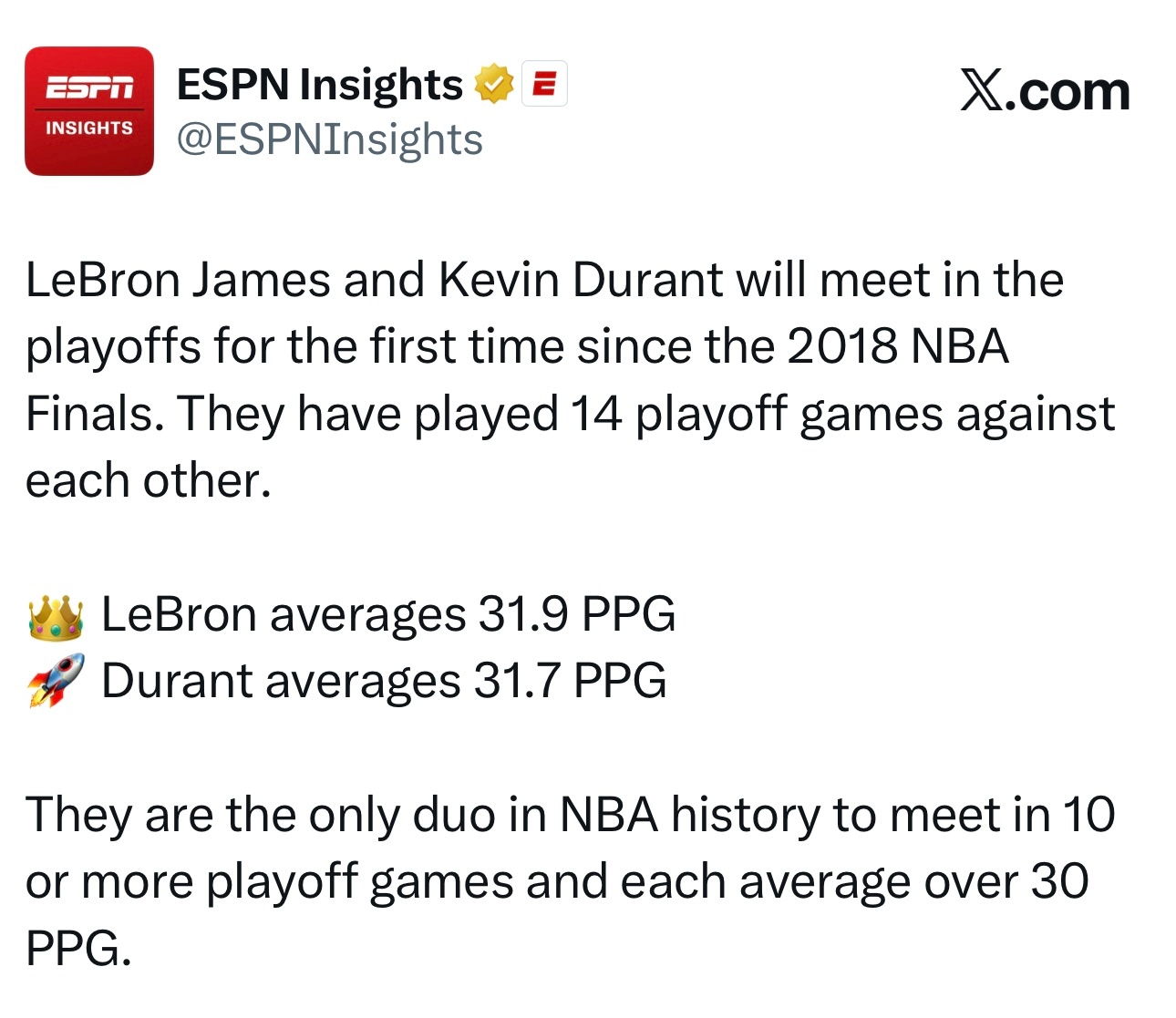 👑 勒布朗场均得到 31.9分🚀 杜兰特场均得到 31.7分