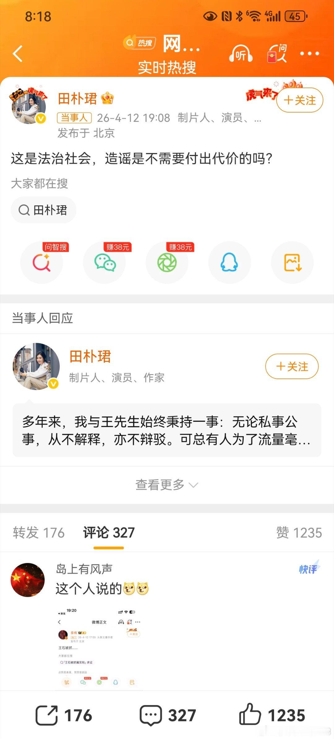 田朴珺回应网传王石被抓田朴珺、王石一起回应“王石被抓”。发帖子的人手快,删帖子恐