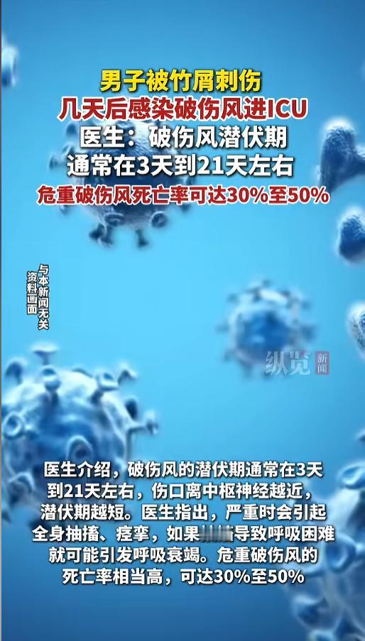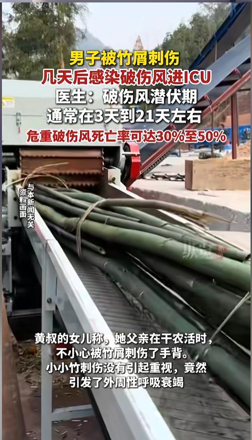 信息来源:《据大河报4月12日消息,广东梅州,男子被竹屑刺伤感染破伤风进ICU》纵览新闻