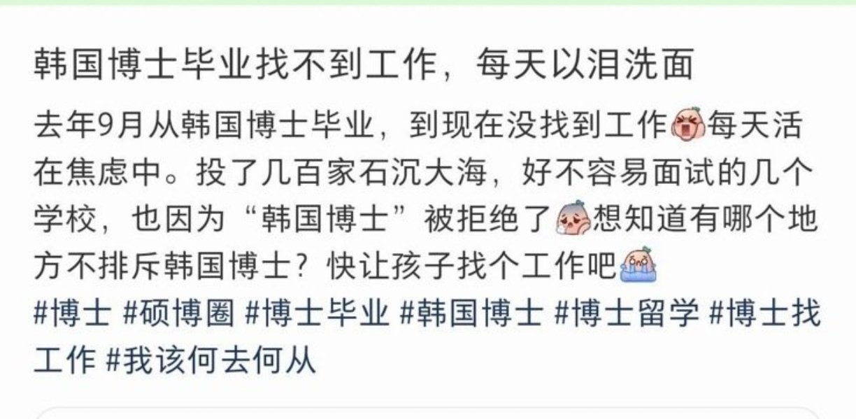 留韩博士找不到工作,每天以泪洗面。问:什么专业?答:汉语言文学。