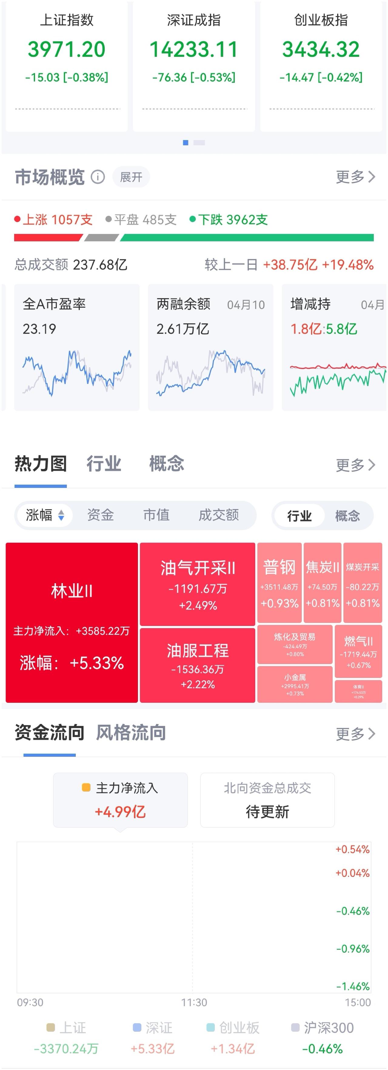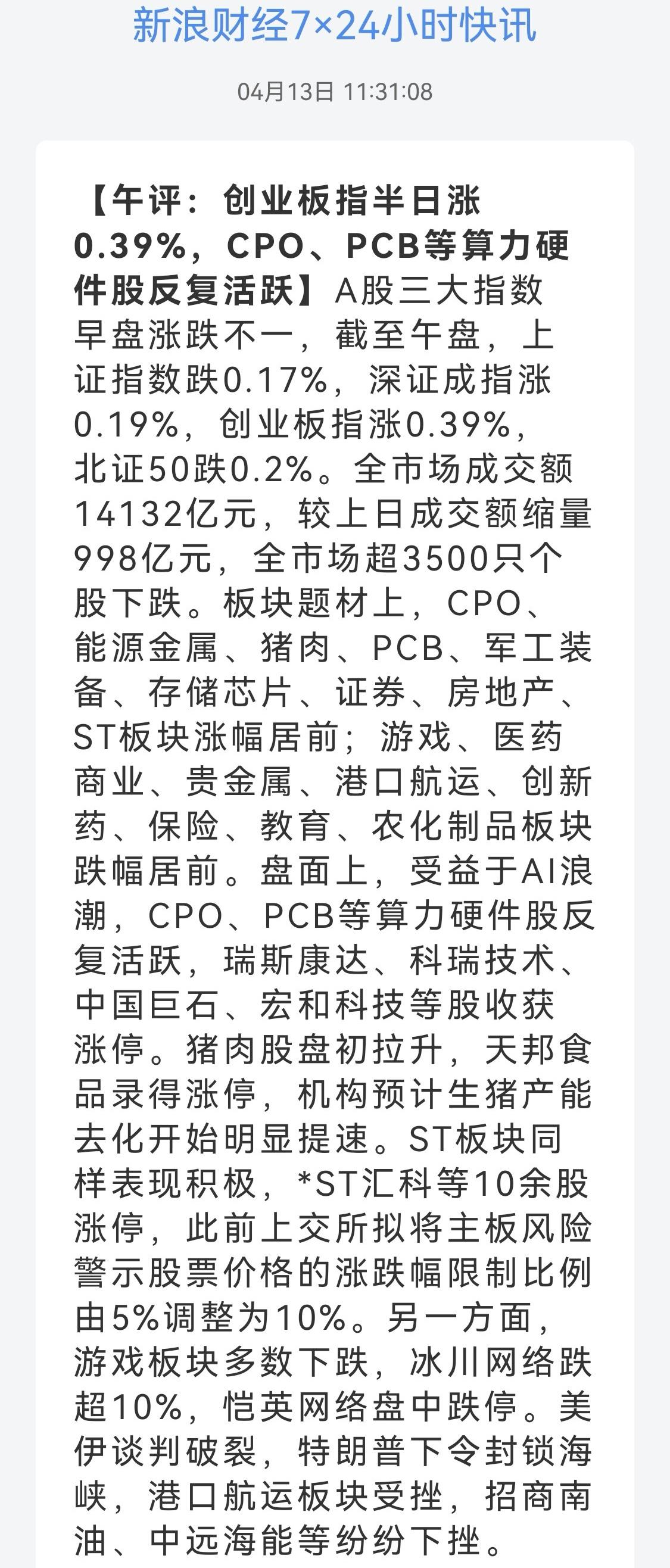 午盘:沪-0.17%、深+0.19%、创+0.39%。