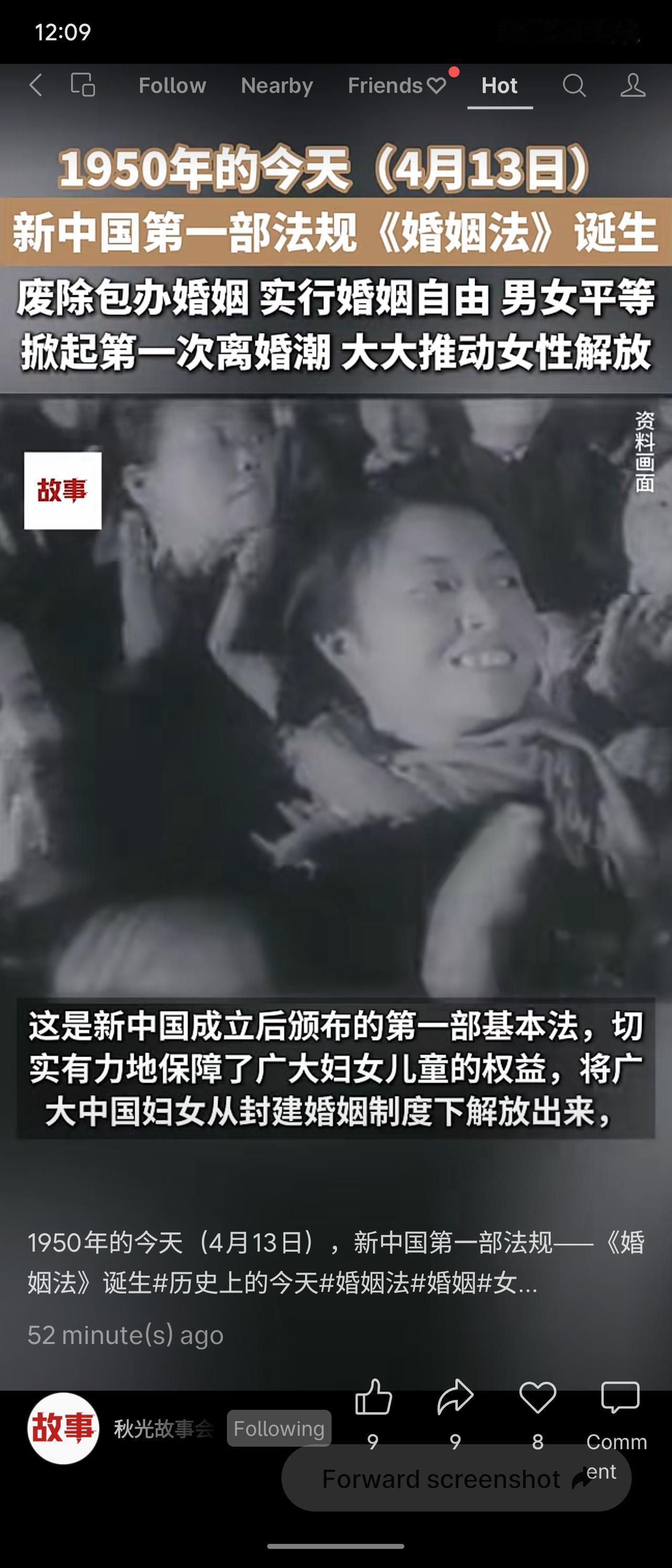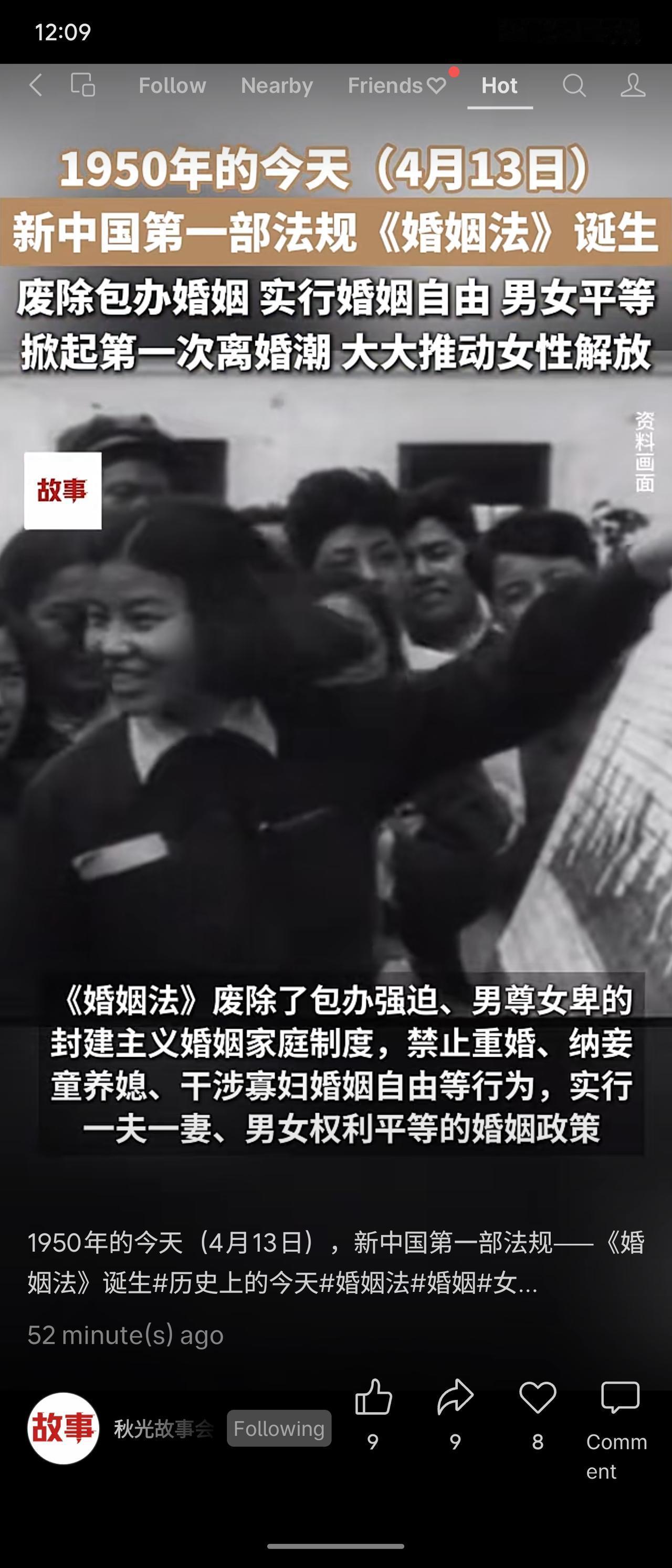 1950年4月13日,新中国第一部法规《婚姻法》诞生,5月1日实施。它废除包办婚姻、男尊女卑,实行婚姻自由、男女平等、一夫一妻,禁止重婚、纳妾、童养媳及干涉寡妇婚姻自由,掀起第一次离婚潮,有力推动女性解放,保障妇女儿童权益。