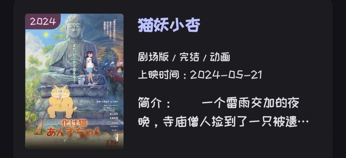 《猫妖小杏》很有意思的剧情,转描的画风非常好看!动漫点评团日漫 一个雷雨交加的夜晚,寺庙僧人捡到了一只被遗弃的小猫,并为它取为“小杏”,数十年后,小杏竟然长成了一只会说人话的巨大“猫妖”。在一次偶然的契机下, 少女花梨与猫妖小杏展开了一场穿越地狱的奇幻冒险之旅...