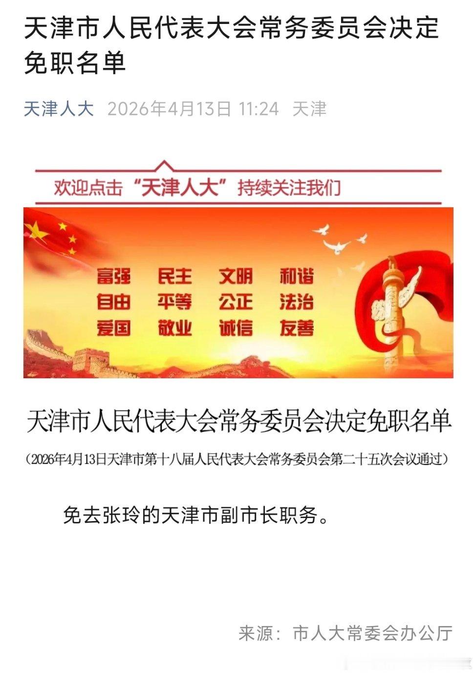 履新天津市委常委后,张玲卸任副市长职务。