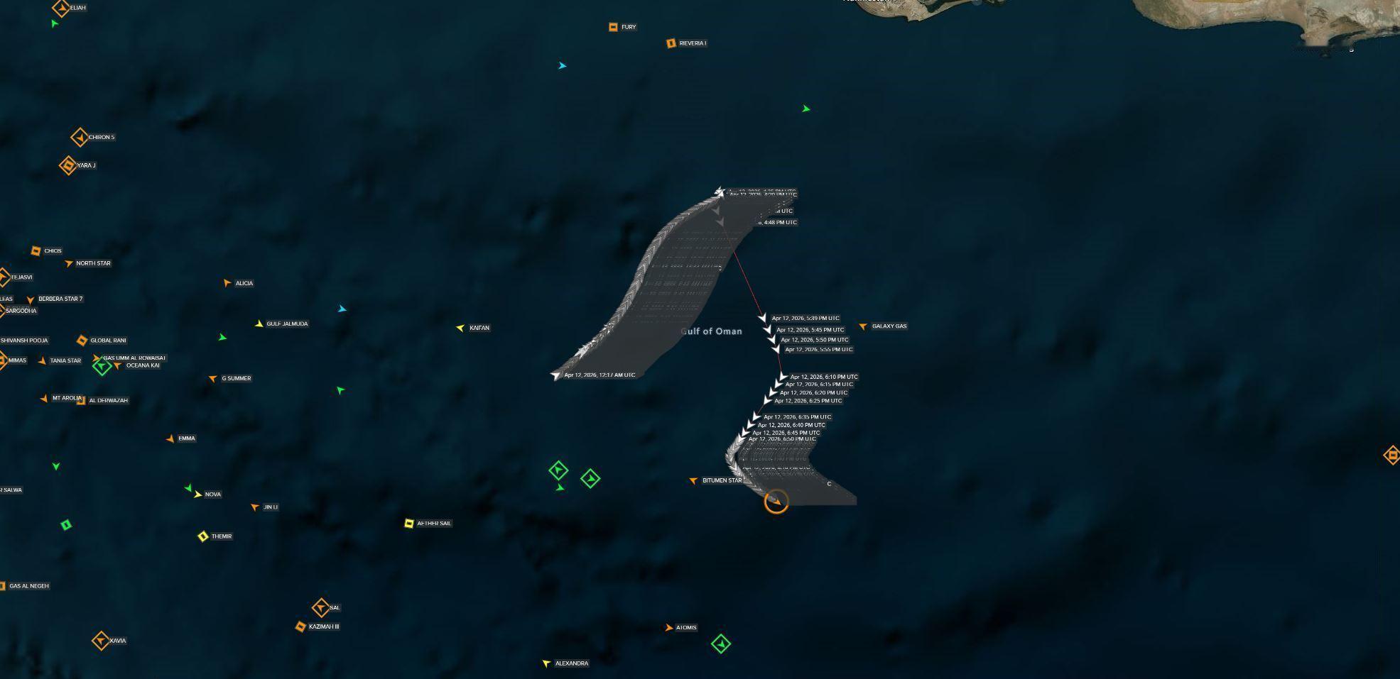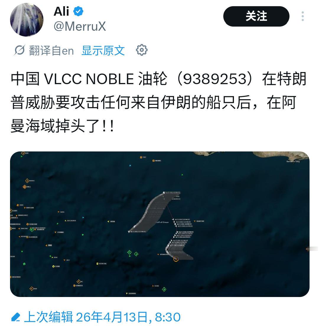 外网消息:一艘从中国舟山出发、注册地是中国香港的超大型油轮“诺布尔”号(VLCC NOBLE,IMO编号:9389253),原计划前往波斯湾装载石油,但该油轮于(北京时间)4月13日凌晨1点多,在阿曼海湾附近突然掉头。