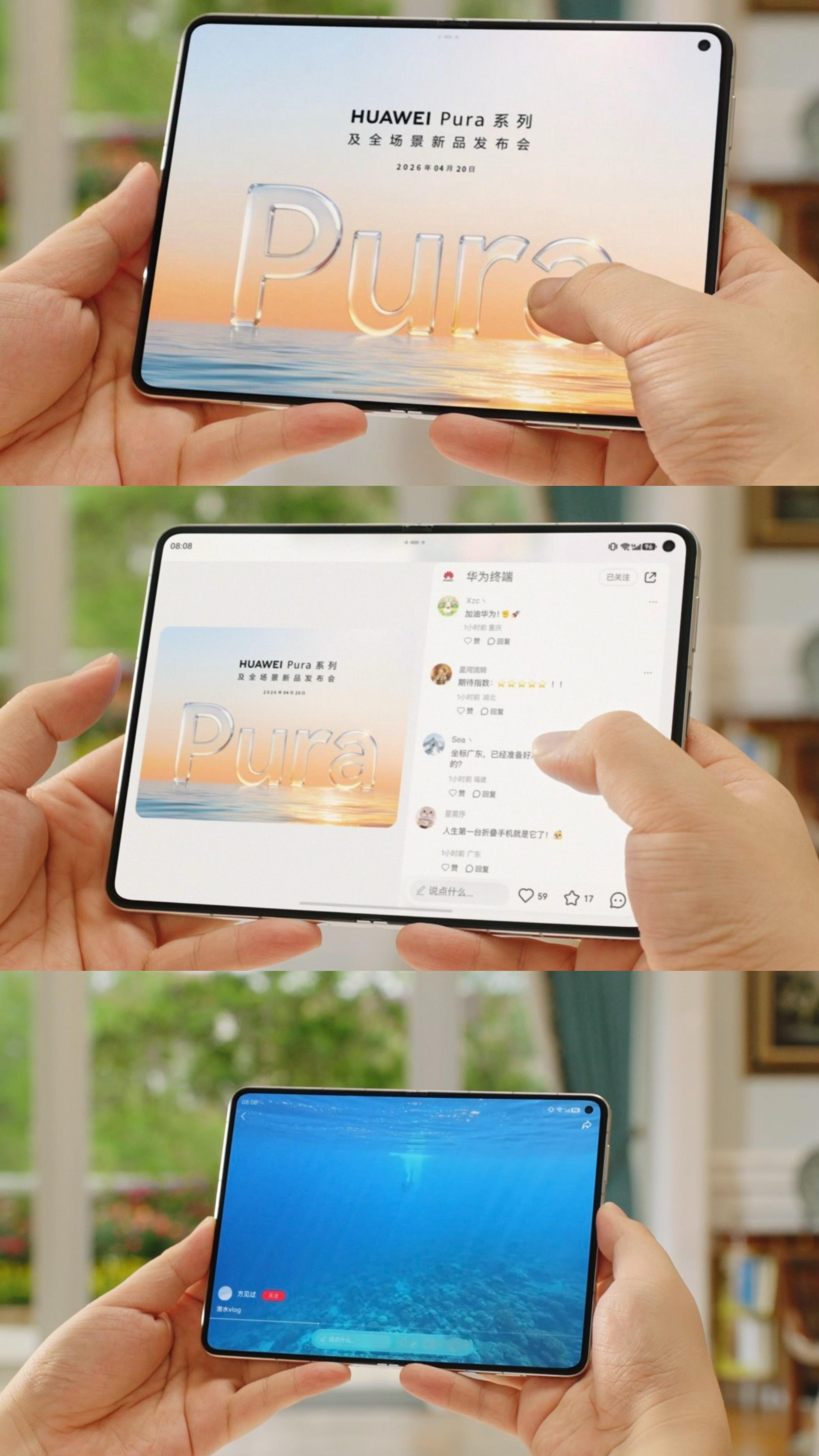 余承东首曝大阔折真机 华为官宣大阔折命名PuraXMax 4月13日,余总和华为终端发布官宣视频,正式揭晓全球首款大阔折华为Pura X Max,余承东余总上手使用一个月表示爱不释手。就在新机亮相前,IDC 最新折叠屏市场数据给出有力佐证:华为Pura X 上市一年,出货量突破 150 万台,单款是第二、三、四名的总和,2025 年中国折叠屏手机市场,华为以 71.8% 的份额稳居绝对主导。阔折叠也从小众创新形态,彻底成为被市场和消费者认可的主流折叠方向。华为Pura X Max作为全球首款大阔折,不仅在产品节奏上领先某果同类产品半年,更直接推动友商两大行业巨头集体跟进阔折叠赛道。而更大更舒展的屏幕,带来的直观感受就是太阔了,移动办公、影音观影、游戏娱乐,都能拥有更沉浸的使用体验,搭配舒适的握持手感,日常主力使用完全无压力。配置方面,华为Pura X Max有望搭载二代红枫影像,拍照能力再攀新高,核心芯片也预计迎来升级,性能表现值得期待。作为全新形态的高端旗舰折叠,华为Pura X Max定位对标华为Mate X7,大家觉得最终定价会是多少呢?不必着急,所有悬念都将在发布会正式揭晓,狠狠期待住了。