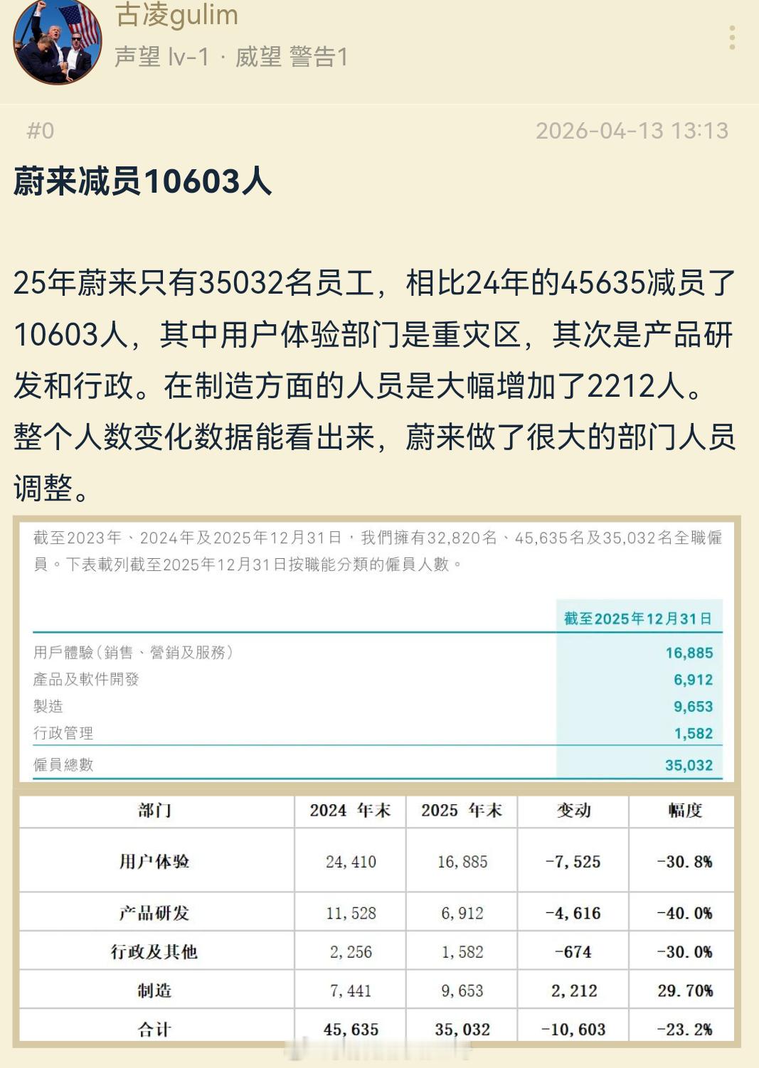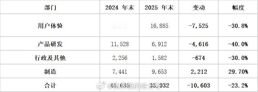 蔚来员工25年相比24年的45635少了10603人,研发人员减少了40%,目前研发人员6912人。