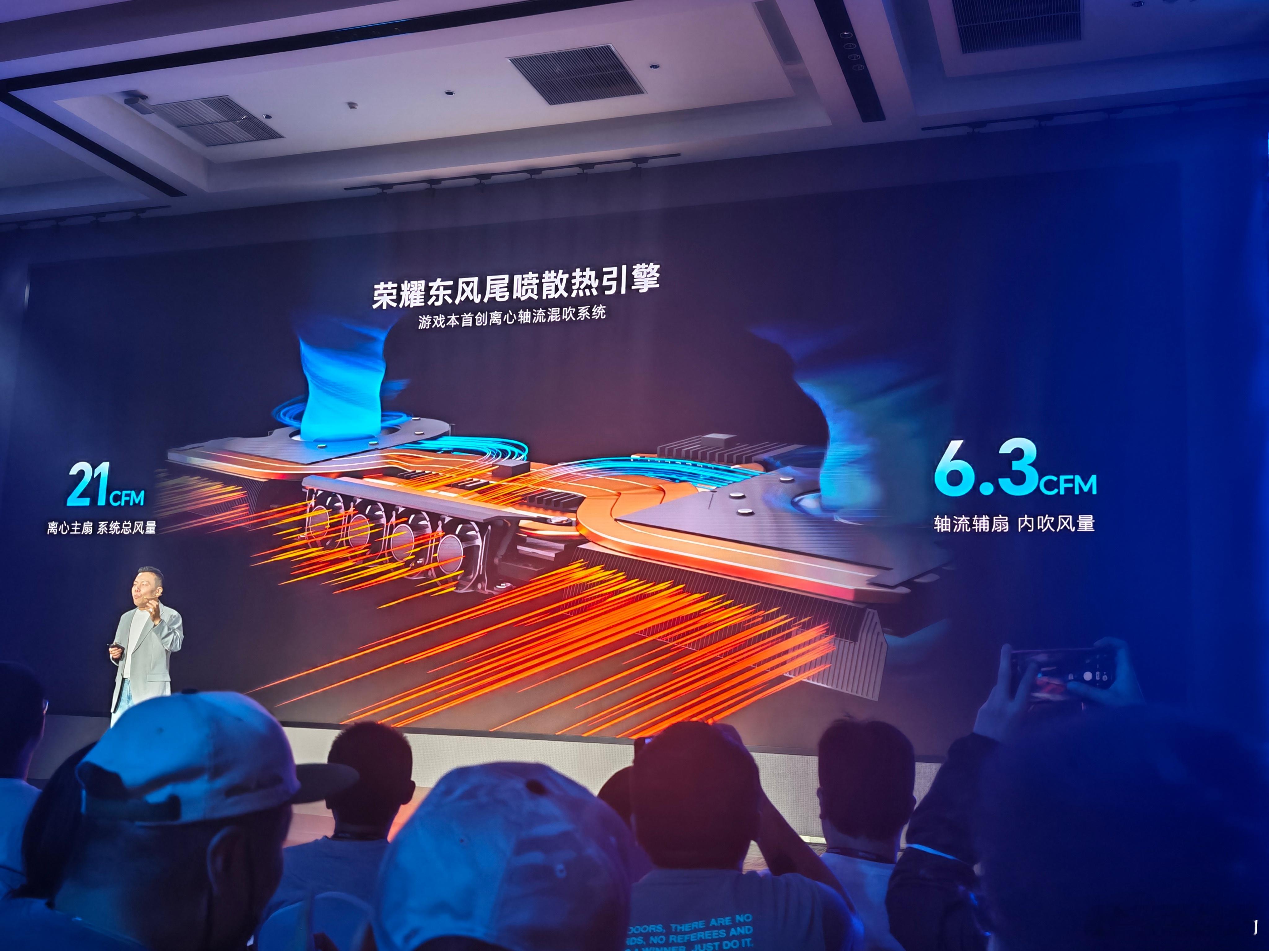 结果才哥就公布荣耀东风尾喷散热引擎,从材料到设计,各方面都有升级和优化,把风扇做小做强,散热无压力。