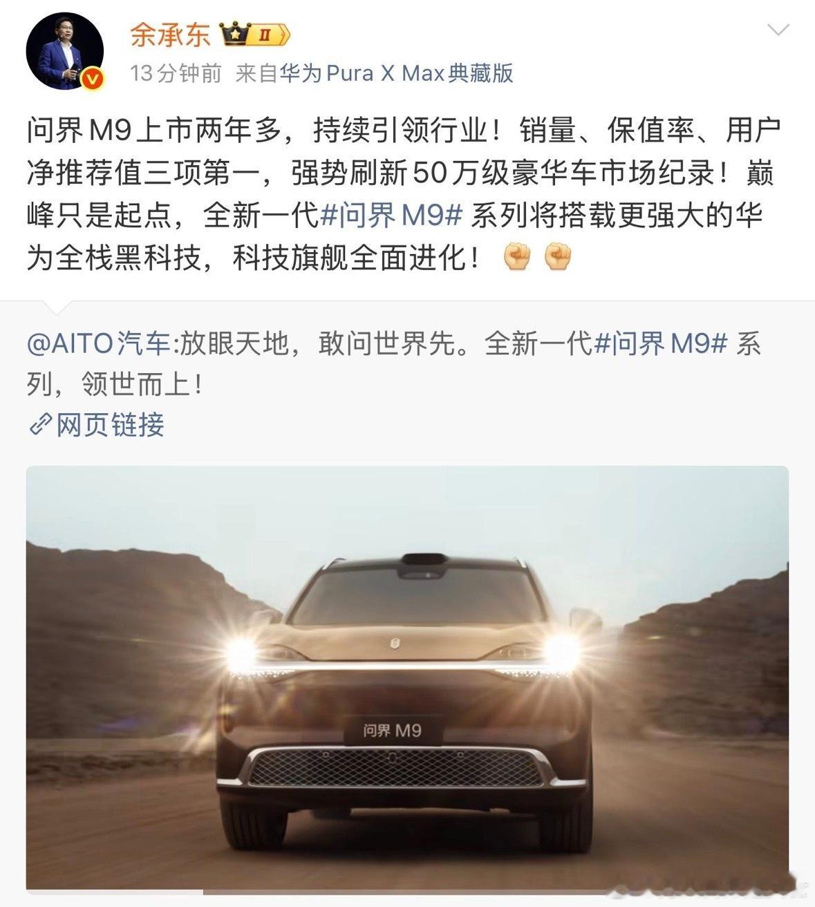 中国汽车高端化之路不仅从来都布满荆棘与挑战,而且如同穿越一片无人涉足的艰难无人区,此前少有中国汽车品牌能在50万以上价位实现大规模交付,并且连续多月稳坐销冠宝座,而问界M9不仅率先突破这一行业壁垒,还成为中国高端新能源市场的核心风向标,随着余承东官宣全新一代车型的到来,更将以标杆之力带动更多中国汽车品牌穿越高端化无人区,既共筑中国科技豪华的核心竞争力,又改写全球高端市场固有格局,这样的破局精神,难道不值得我们欣赏吗?余承东称问界M9巅峰只是起点