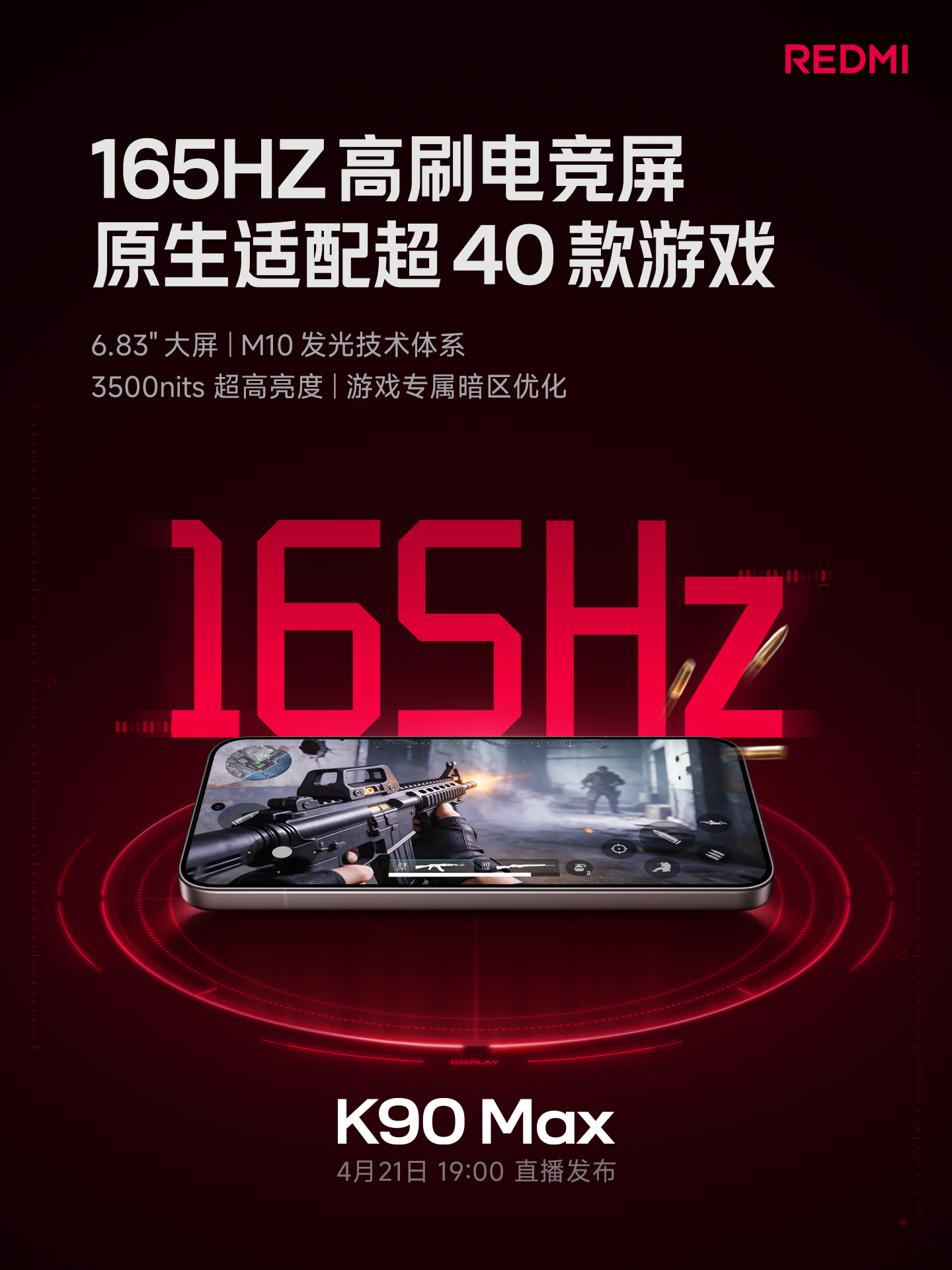REDMI K90 Max采用了6.83英寸165Hz电竞屏,3500nits 超高亮度,原生支持超40款游戏 165fps模式,《三角洲行动》首批支持165FPS+高清画质,游戏音效增强,脚步响度+200%,4月21日见!