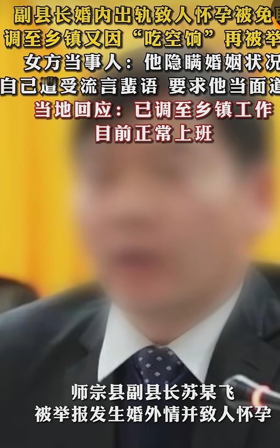 云南曲靖,一男子为副县长,被女子举报,隐瞒婚姻和女人婚外情造成女子怀孕后,被免去副县长职务,降为二级主任科员,但是一直没有正常到岗,又被女子举报吃空饷,也已经被党内警告处分,并且追缴未在岗期间多领取的工资和补贴,女方当事人还要求其当面道歉,因为造成了她抑郁状态,只能辞职就医,网友纷纷说:男人不靠谱,女人早干嘛去了。