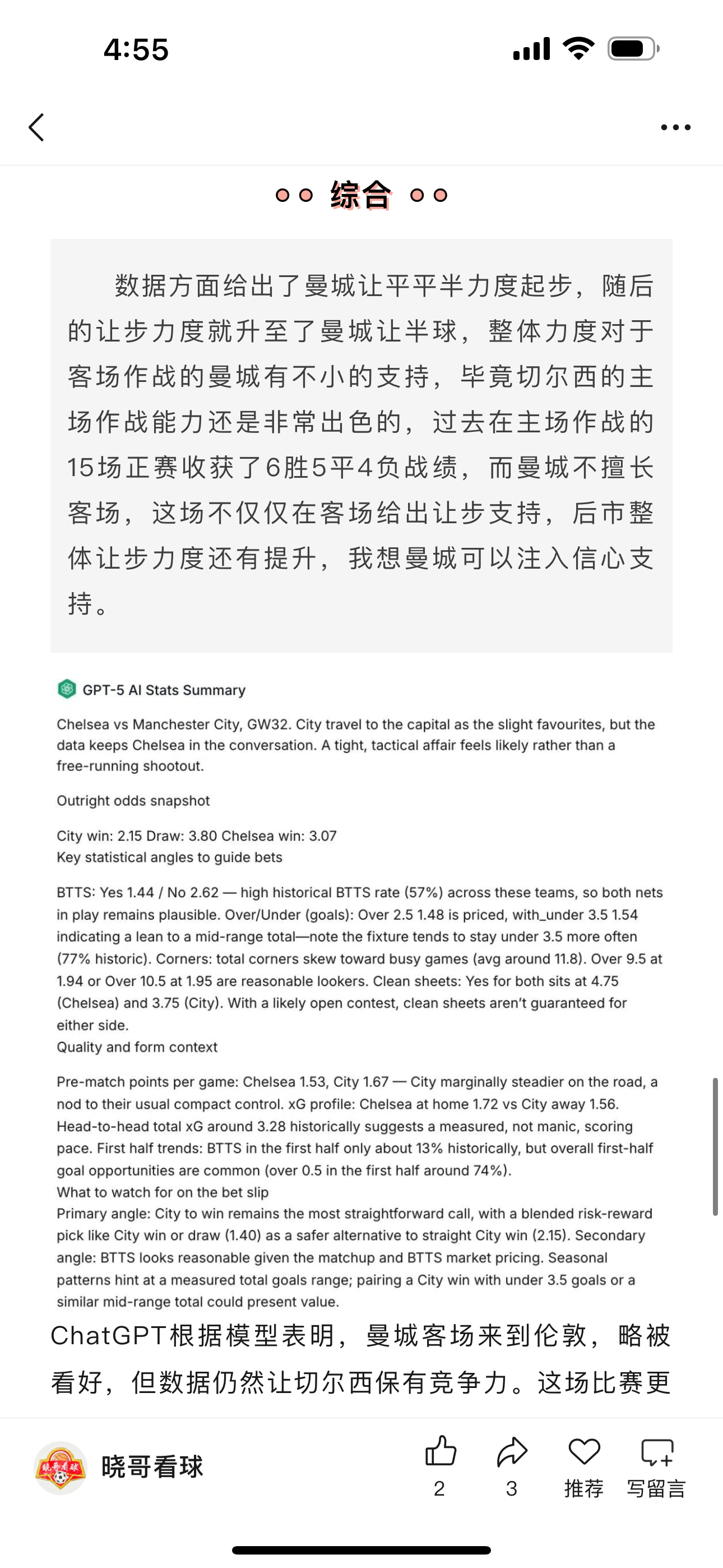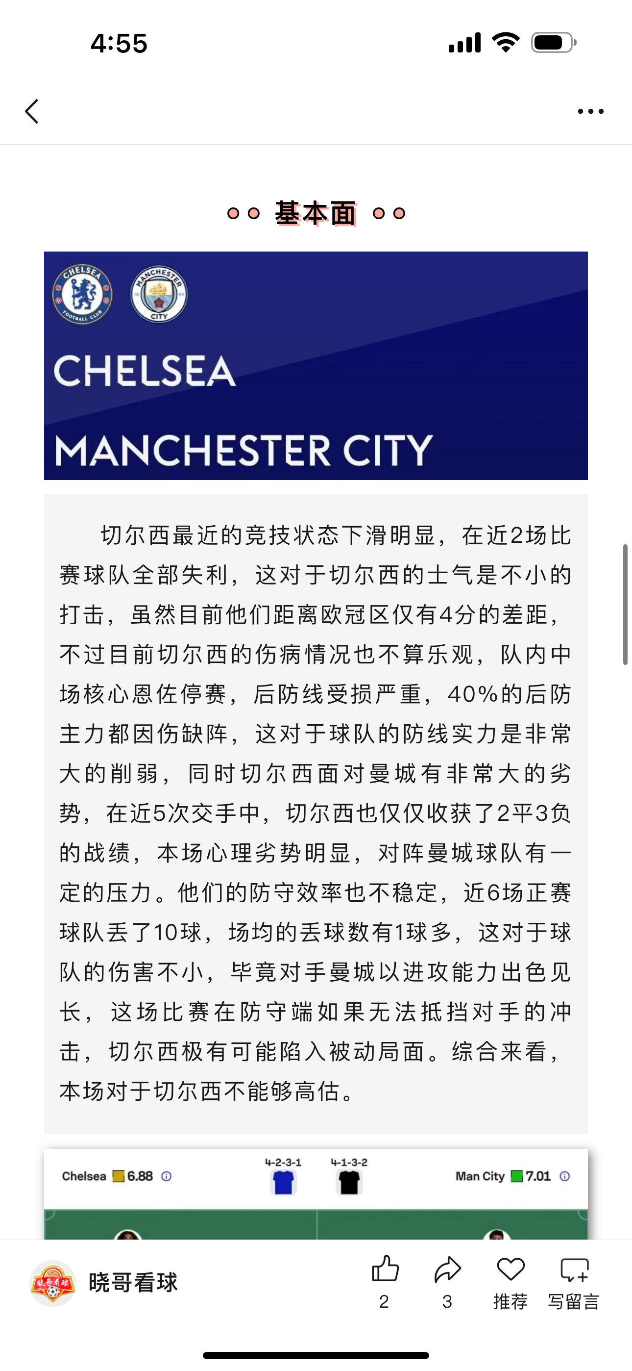 昨日公推英超曼城方向成功收获好评成绩,这场比赛曼城在中场完全碾压,控球、传球和逼抢次数全面占优,这个我在析文中就有提到切尔西的伤病主要打击的就是中场,整体中轴线的崩塌让他们面对曼城的时候相当吃力,加上曼城本场也有不俗的战意加持,因此这场切尔西难以招架能够理解,全场3:0的比分展现了两队的差距,这场好评合理。体彩足球预测体育赛事英超切尔西vs曼城