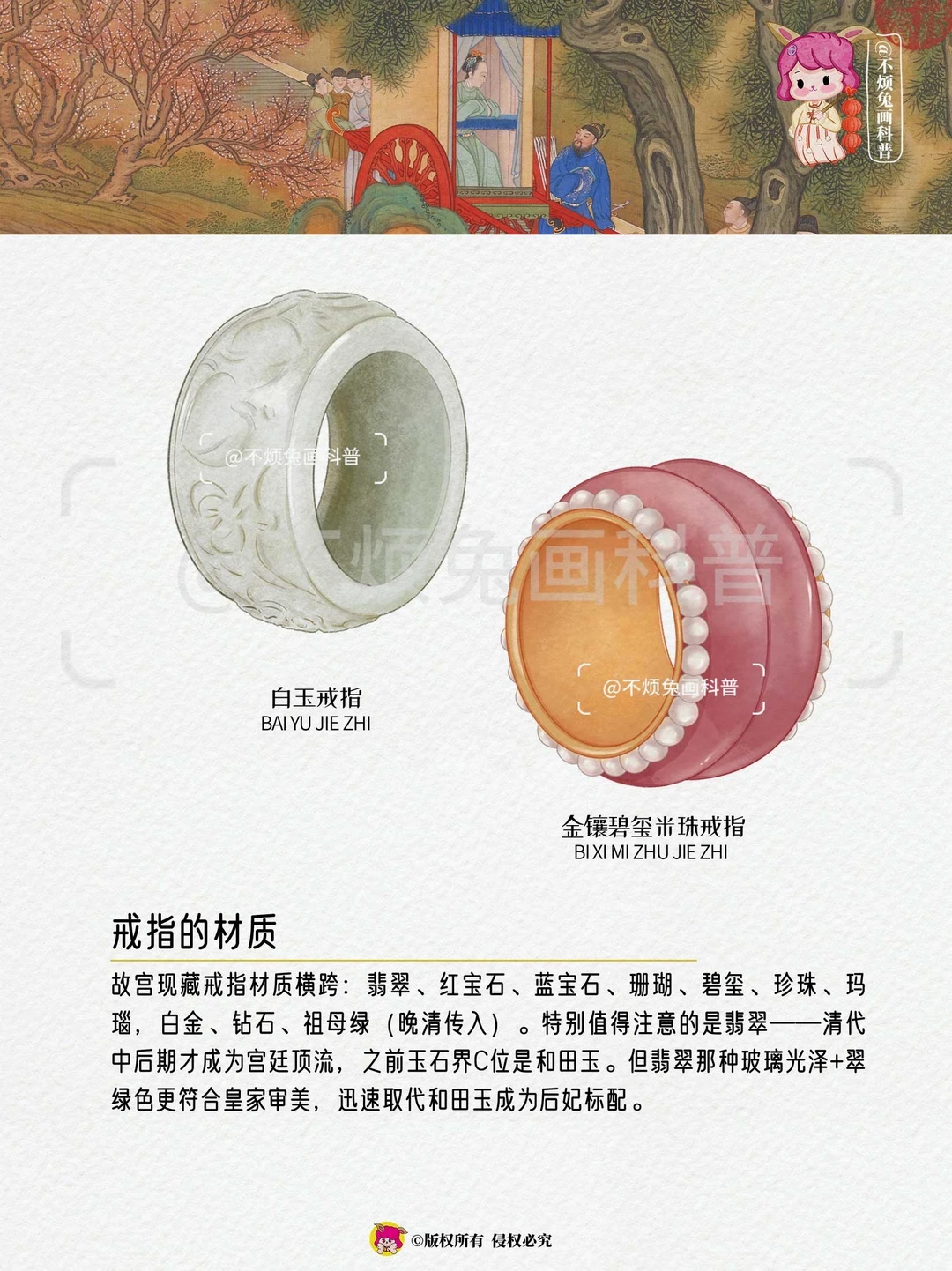 故宫现藏戒指材质横跨:翡翠、红宝石、蓝宝石、珊瑚、碧玺、珍珠、玛瑙,白金、钻石、祖母绿(晚清传入)。特别值得注意的是翡翠——清代中后期才成为宫廷顶流,之前玉石界C位是和田玉。但翡翠那种玻璃光泽+翠绿色更符合皇家审美,迅速取代和田玉成为后妃标配。