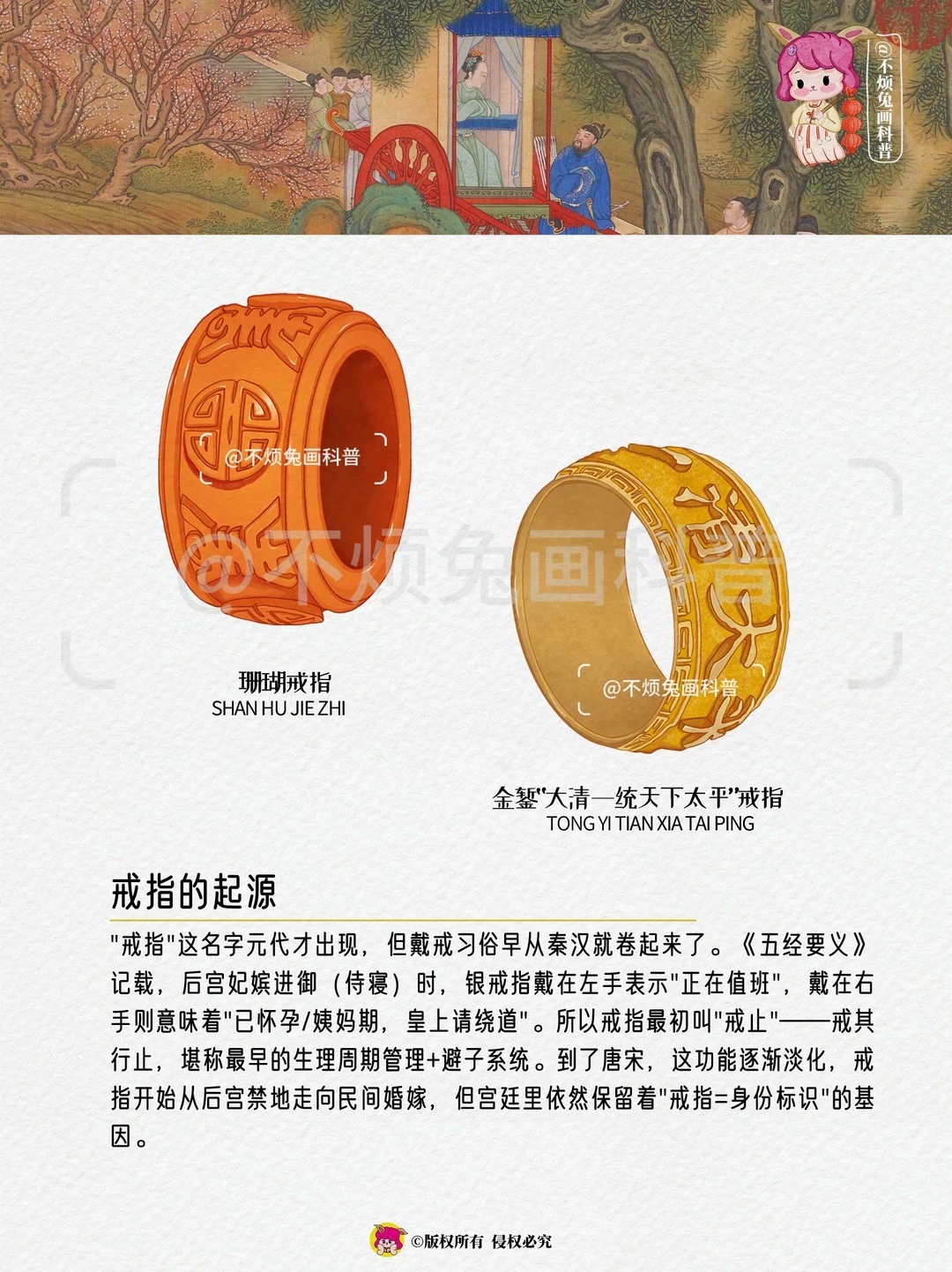 "戒指"这名字元代才出现,但戴戒习俗早从秦汉就卷起来了。《五经要义》记载,后宫妃嫔进御(侍寝)时,银戒指戴在左手表示"正在值班",戴在右手则意味着"已怀孕/姨妈期,皇上请绕道"。所以戒指最初叫"戒止"——戒其行止,堪称最早的生理周期管理+避子系统。到了唐宋,这功能逐渐淡化,戒指开始从后宫禁地走向民间婚嫁,但宫廷里依然保留着"戒指=身份标识"的基因。