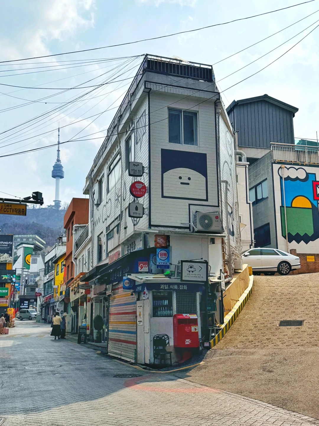 这条街被漫画涂鸦很有活力,背景是首尔塔
