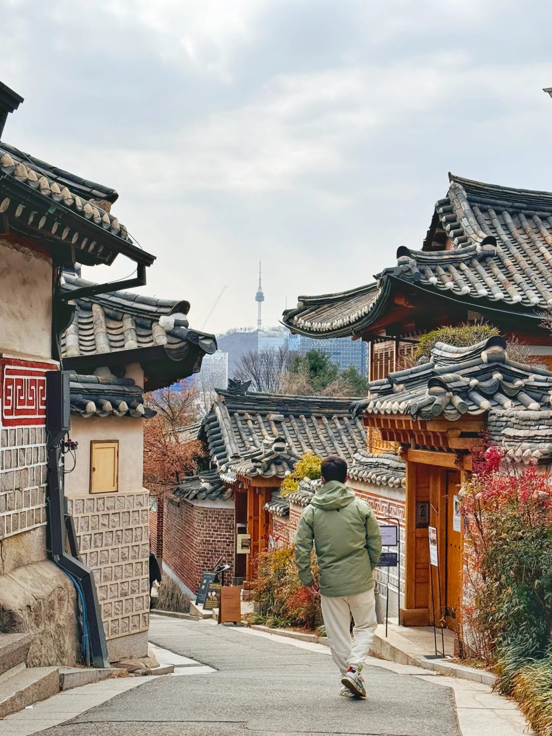 韩国历史民宅,背景可以看到首尔塔!历史与现代交错感