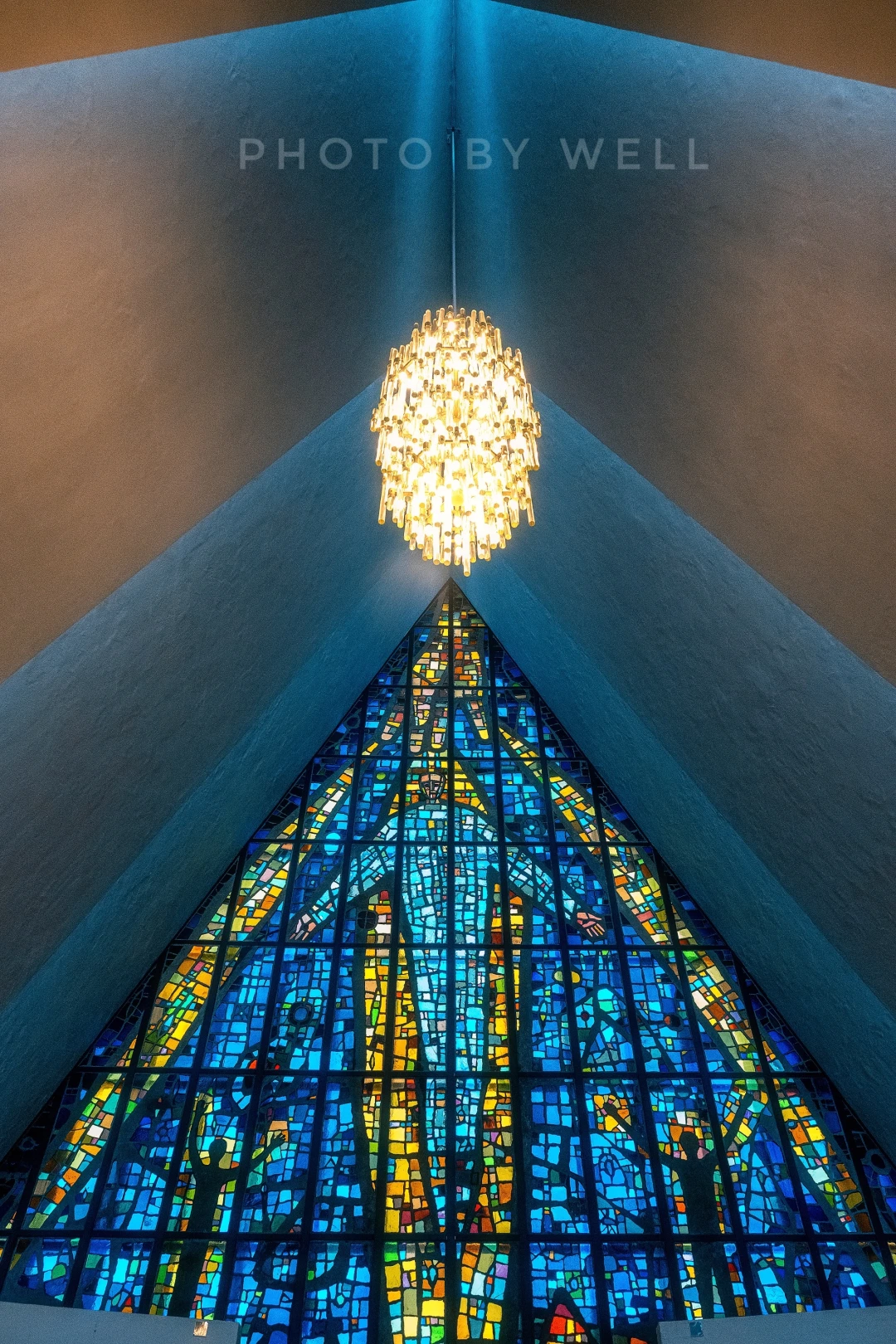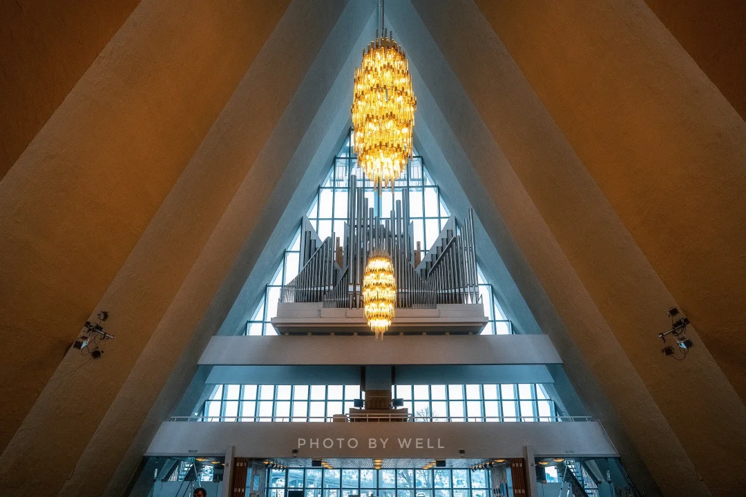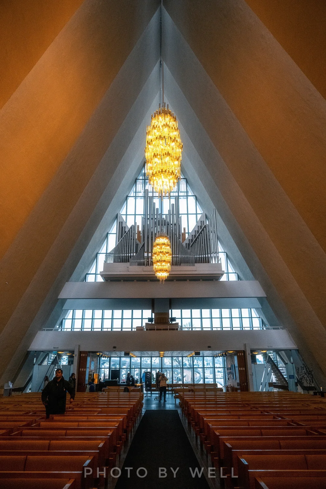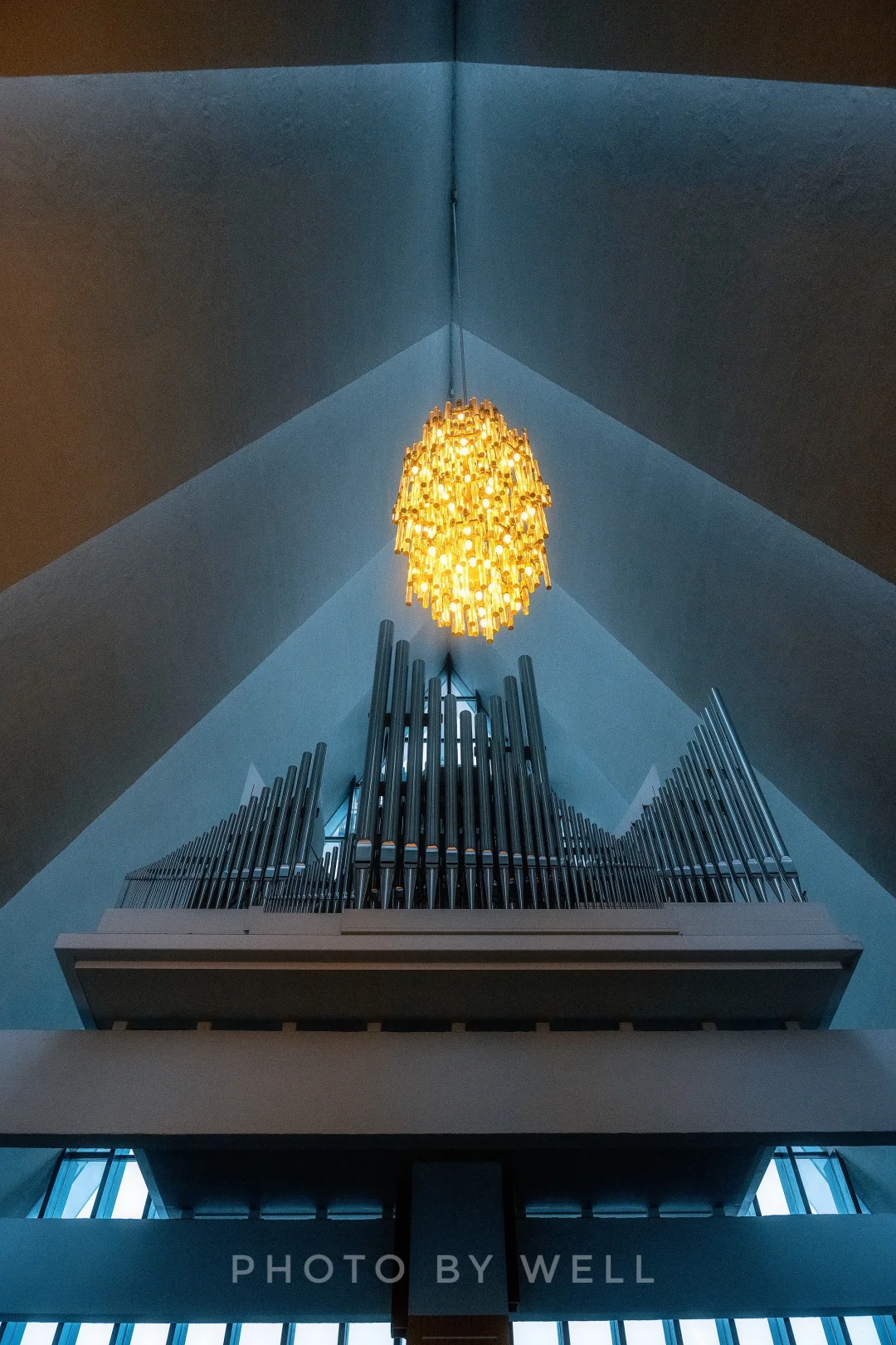 步入教堂,最震撼的是东侧高达12米、重约6吨的彩色玻璃窗(马赛克)。这是北欧最大的彩色玻璃窗之一,由艺术家维克多·斯帕雷设计,描绘了耶稣降临的场景。室内采用浅色橡木长凳和祭坛,风格极简。高处的管风琴拥有2940支音管,其宏大的共鸣声与水晶冰柱吊灯共同营造出神圣氛围。