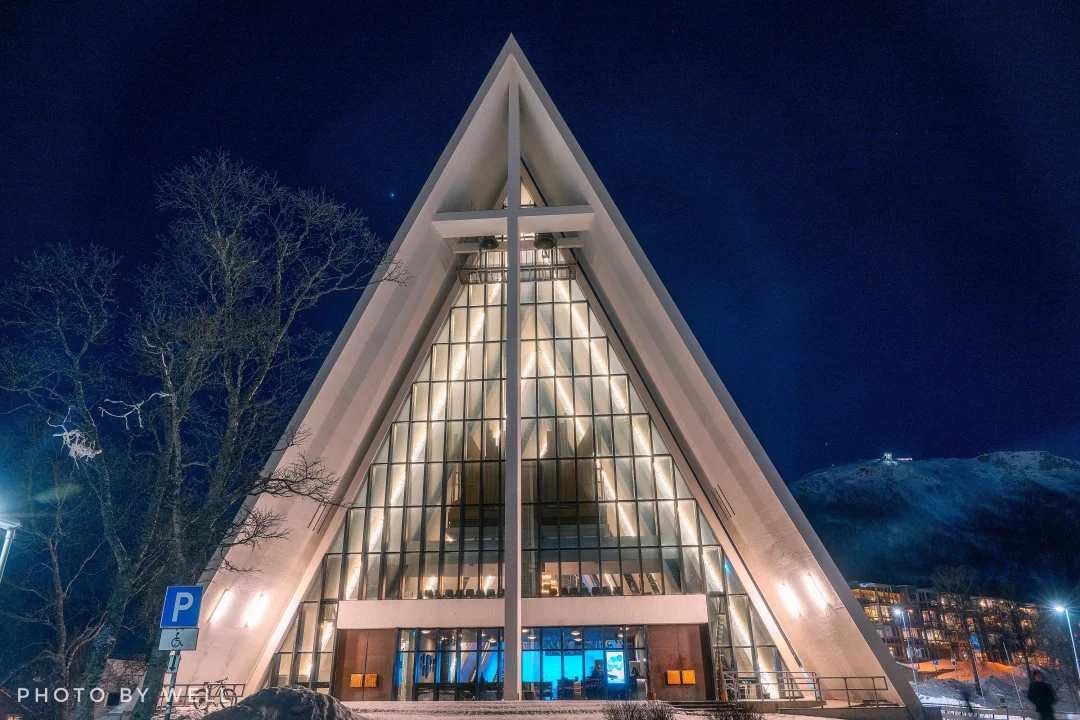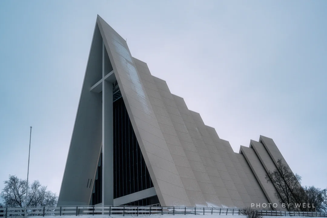 教堂坐落于特罗姆瑟大桥尽头的山坡上,由11块覆盖珍珠灰色釉铝板的混凝土板层叠而成,形成尖锐的三角形轮廓。高约35米的建筑宛如一座漂浮在海面上的冰山,巨大的十字架矗立在入口上方,既是信仰象征,也是视觉支柱。