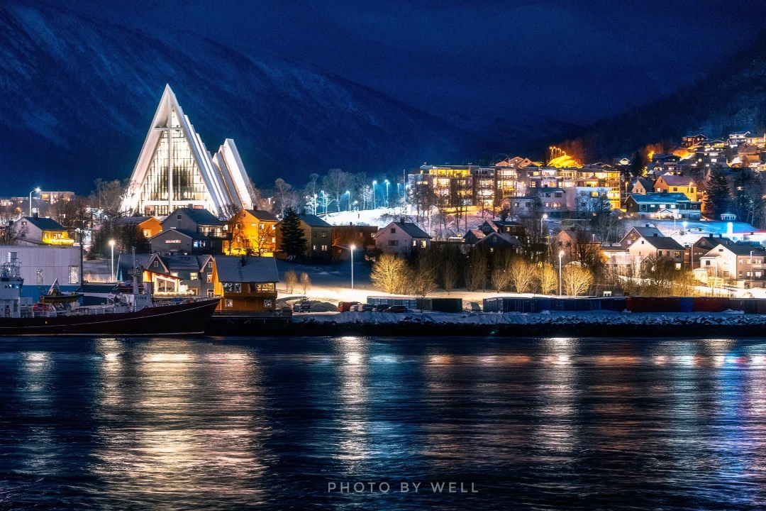 当教堂灯光亮起,宛如黑暗中的水晶灯塔。极夜期的“蓝调时刻”(Blue Hour)是观赏教堂的最佳时机,深蓝色的天空与教堂的暖光形成强烈对比。