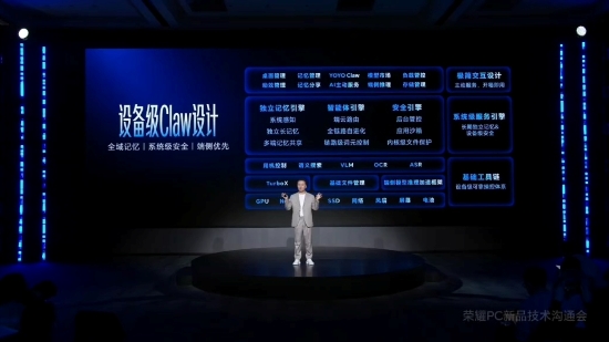 本次沟通会另一大突破,是荣耀正式推出aipc3.0技术,magicbook系列轻薄本凭借自研yoyoclaw技术,开创“养虾本”全新品类,破解ai智能体部署复杂、使用成本高、隐私安全风险三大痛点。该产品出厂预置5大主虾、23子虾,覆盖教育、办公、学术等五大场景,用户扫码即可通过微信、飞书调用,无需复杂配置;端云协同与智能路由设计,让简单任务本地完成、复杂任务按需调用,综合词元消耗较openclaw方案节省50%;独立安全虾实现设备级防护,高危操作自动拦截、敏感操作二次确认,核心数据100%留存本地,落实隐私安全承诺。