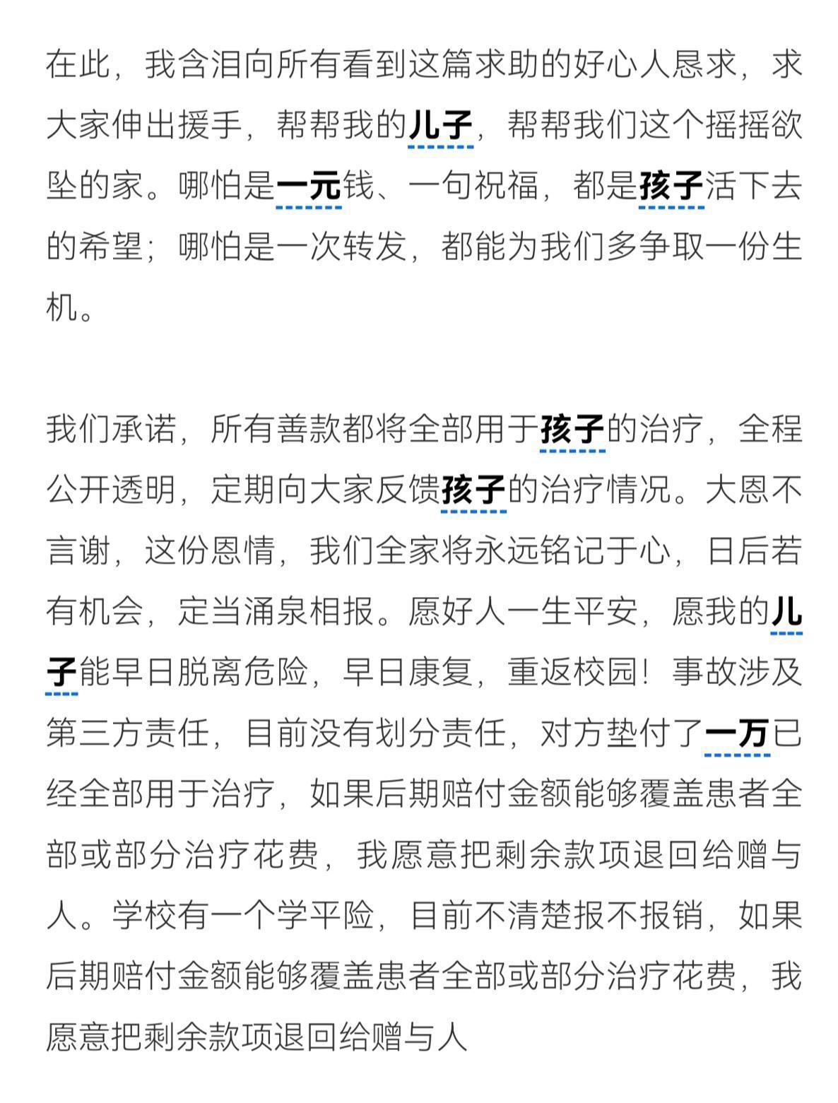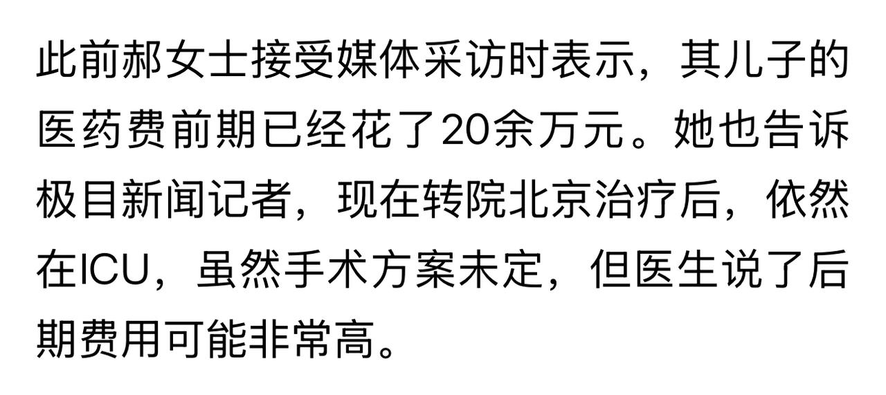 目前,男孩还在ICU进行治疗,已经花去了20多万,目前已经转院到北京大医院的ICU,从医生的话意来看,60万或许都无法覆盖所有医疗费用。