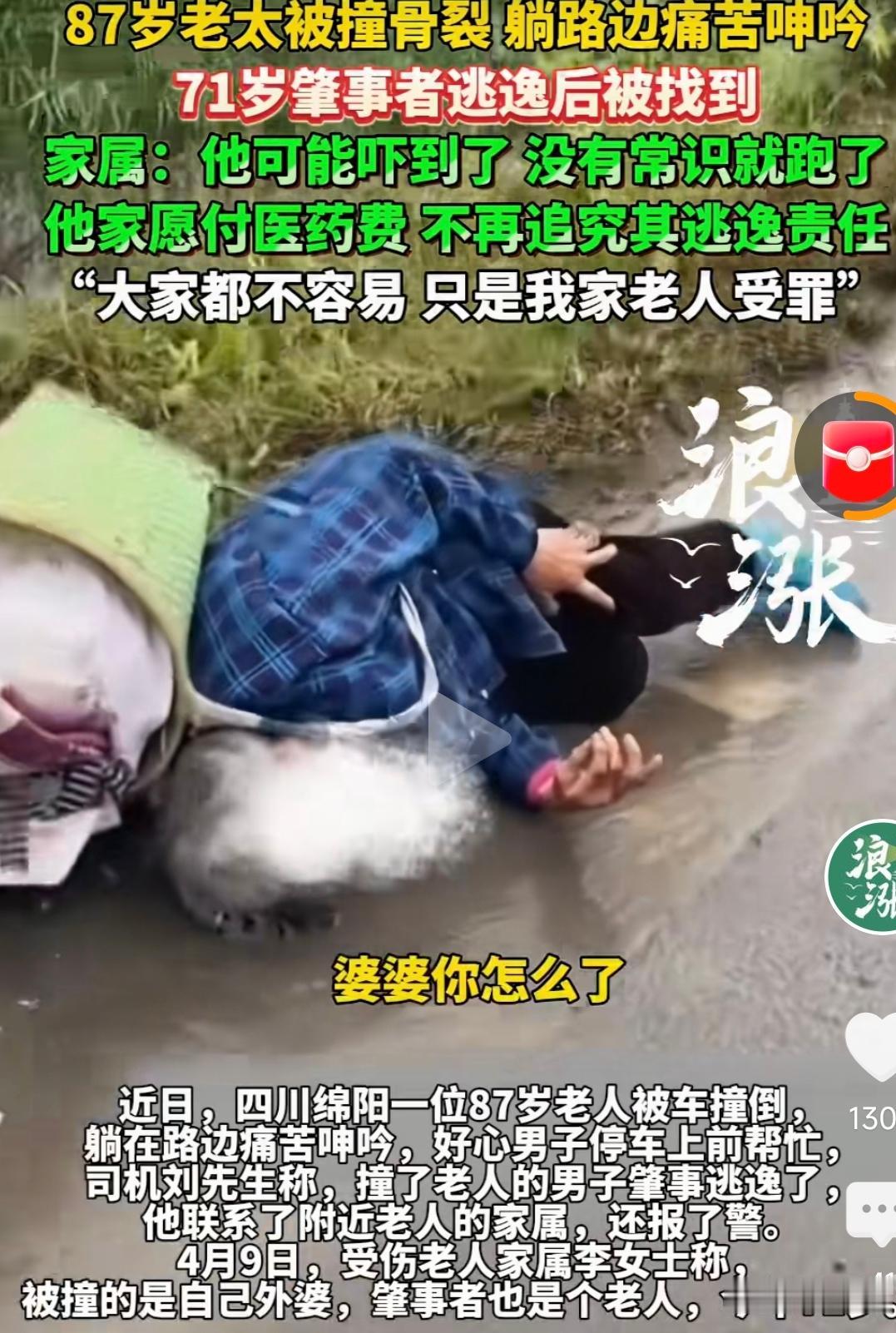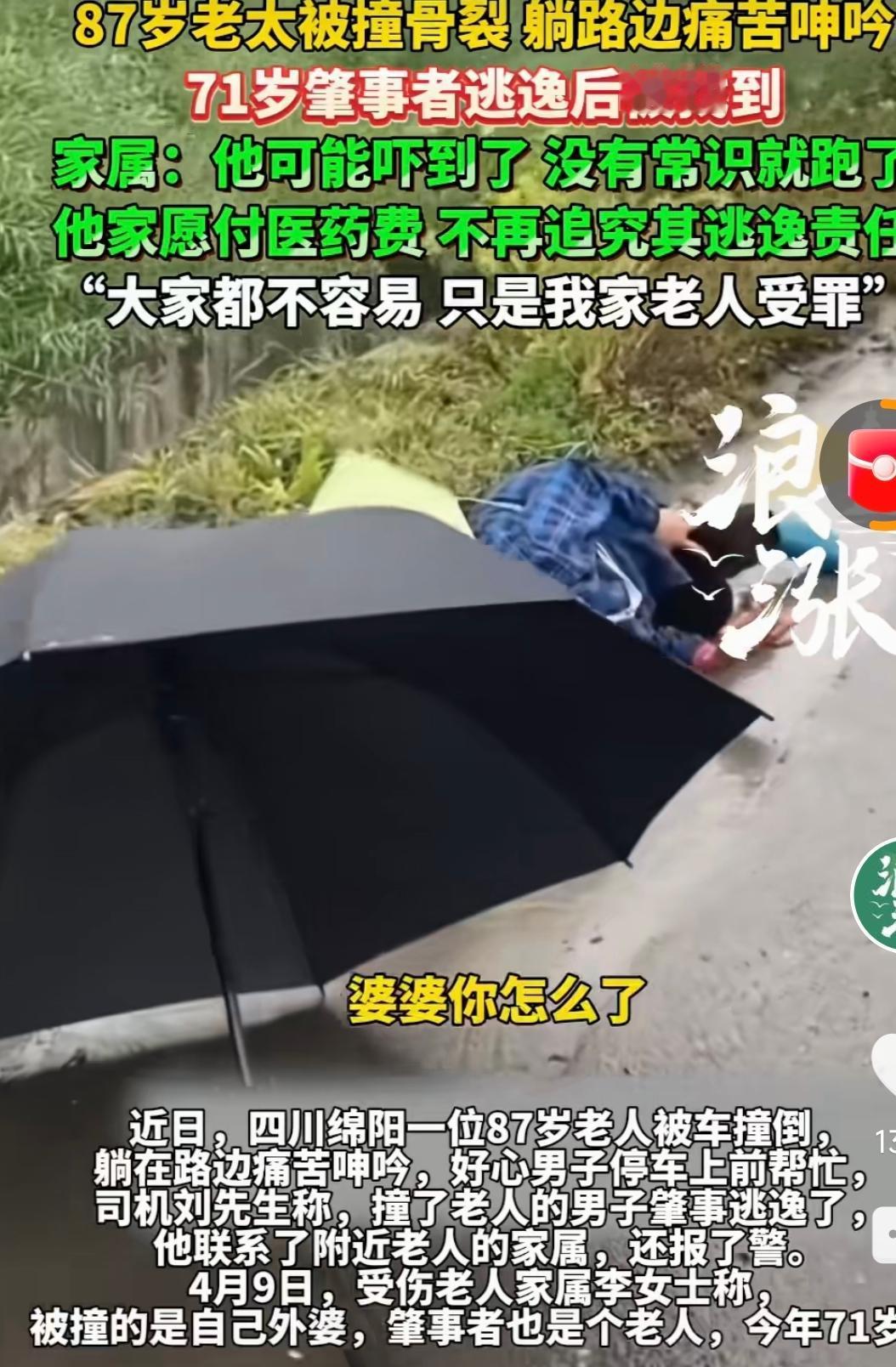四川绵阳,雨天,87岁老太太被摩托车撞到,躺在路边痛苦呻吟,刚好路过一个好心司机帮忙送去医院,检查后是大腿骨裂需要动手术,找到肇事司机时,发现也是一个71岁的老人,他家人表示:估计我家老人也吓坏了,没有常识就跑了,我们愿意付医药费,就不要再追究逃逸责任了。老太太家人选择原谅,说:大家都不容易,只是我家老人要受罪了。网友看到纷纷说:这是多么善良的一家人啊!