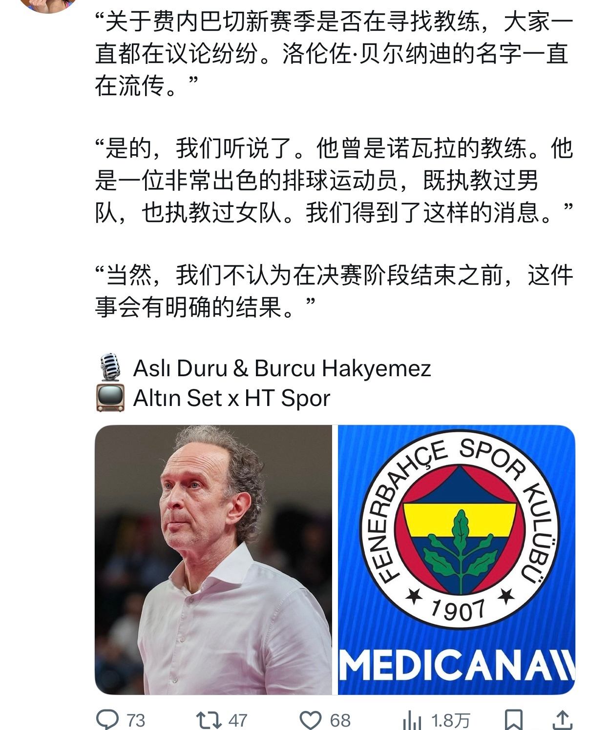 费内巴切女排又在物色新教练啦?贝尔纳迪国际排坛动态