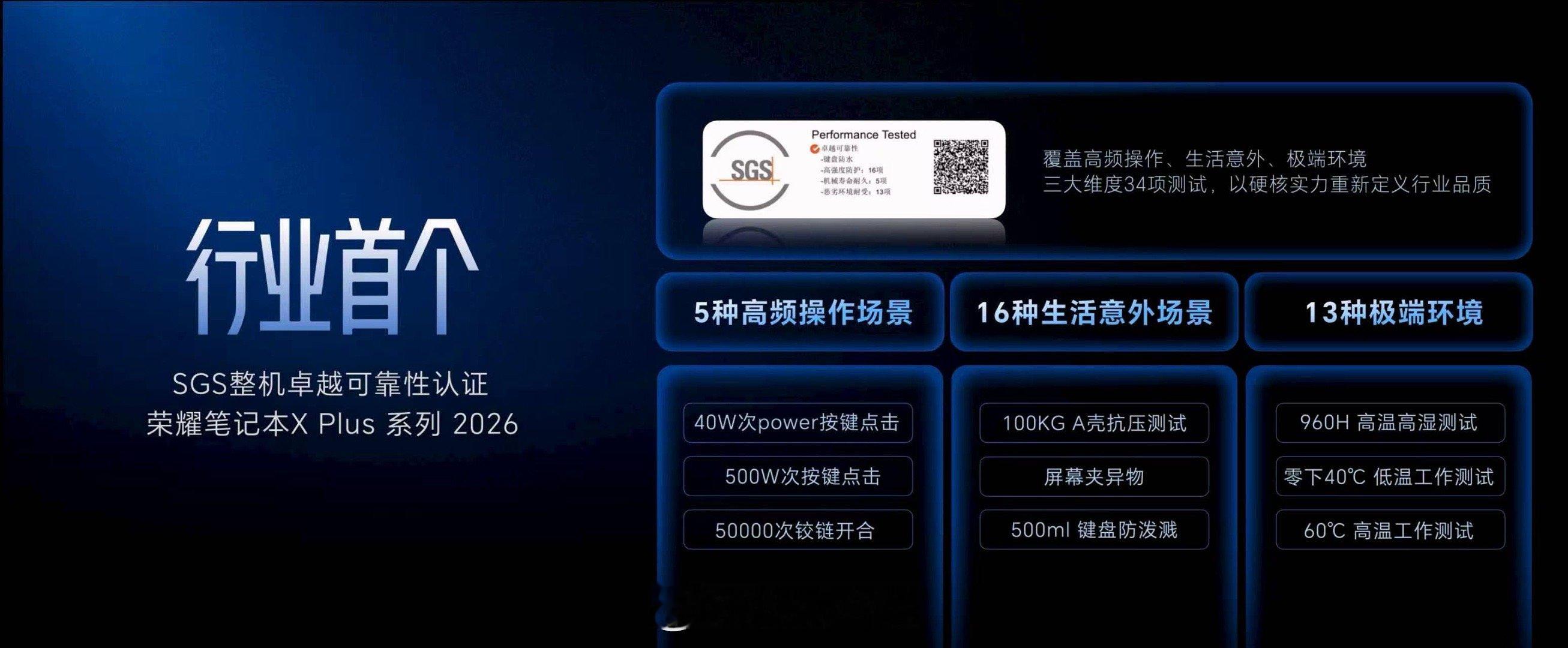 荣耀MagicBook系列以HONOR Turbo X技术,创下了高达16.7小时的X86平台续航纪录,首次超越Apple MacBook Pro 14。 荣耀笔记本X Plus系列2026荣获行业首个SGS整机卓越可靠性认证,及行业首个键盘IPX2级防水认证,铸就行业领先的可靠性保障。