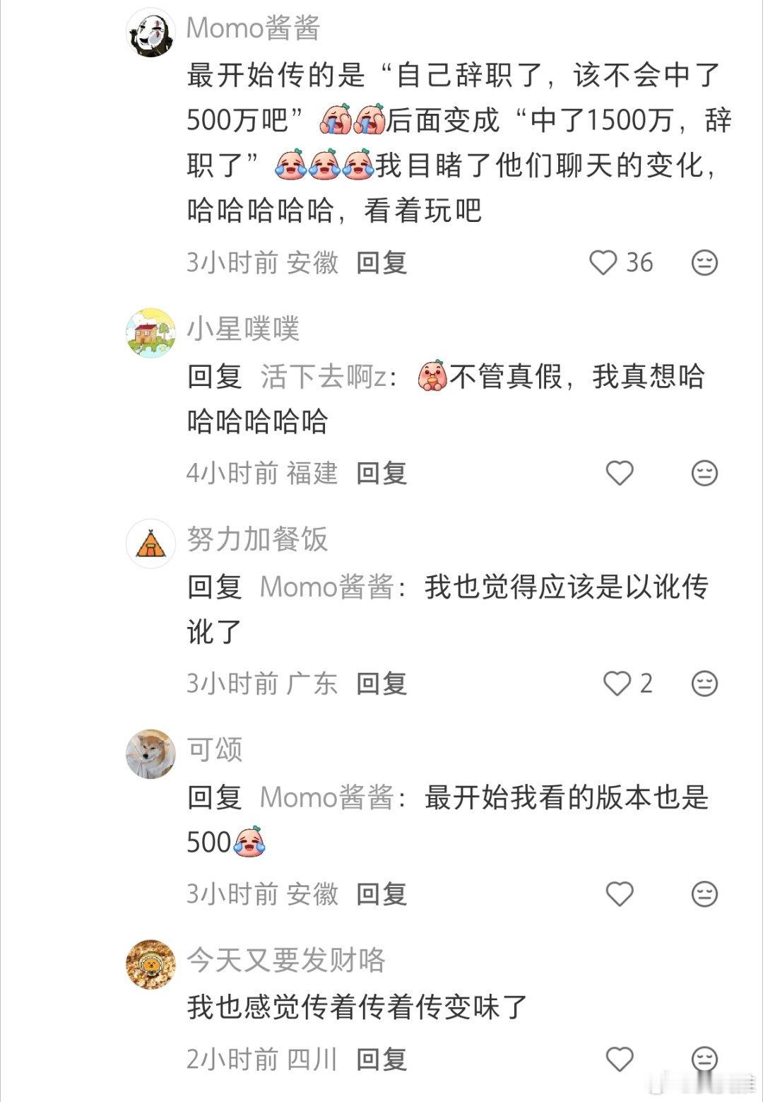 科大讯飞有员工中奖但非1500万网友评论:最开始传的是“自己辞职了,该不会中了500万吧”后面变成“中了1500万,辞职了”我目睹了他们聊天的变化,哈哈哈哈哈,看着玩吧