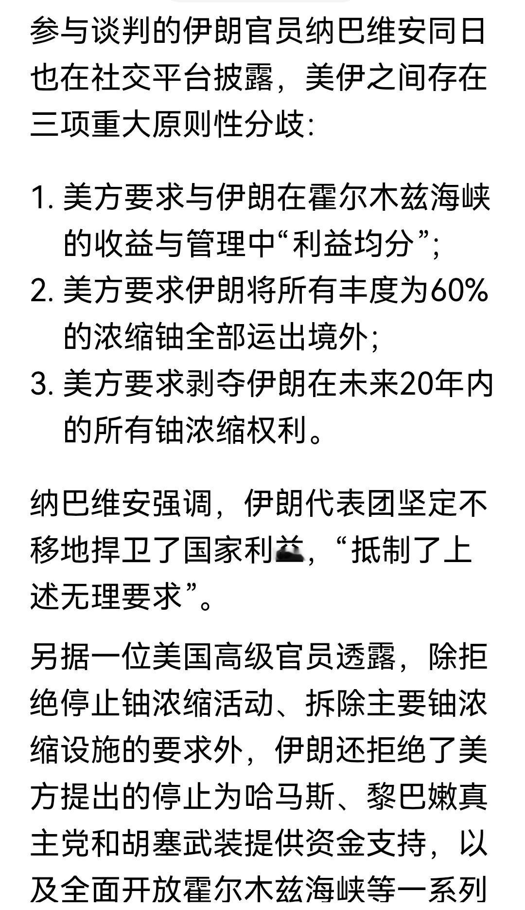 美国三大无理要求,伊朗也是不明事理,浓缩铀问题,不就是美以挑起战争的理由嘛!在这个问题上固持己见,能有什么意义?伊朗反复强调,从来没有制造核武器的计划,那为什么还要死抱着浓缩铀不松手?