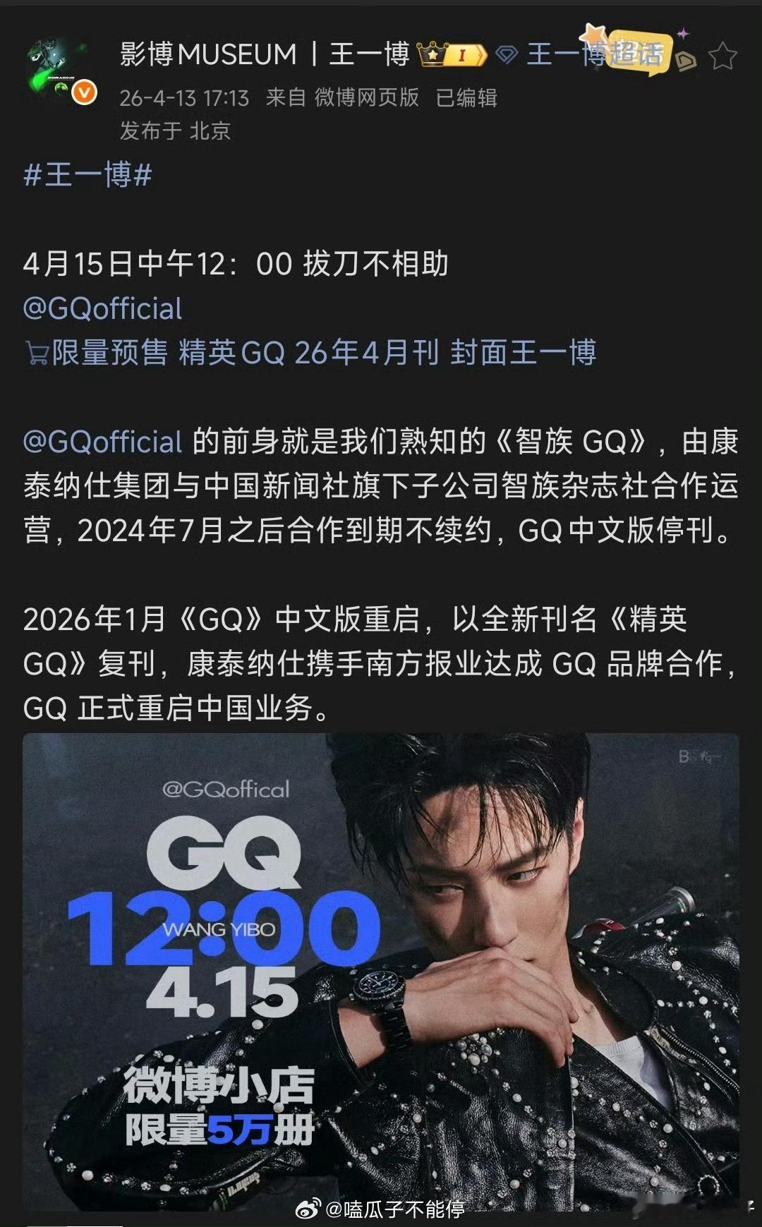 王一博GQ四月刊封面预告酷哥王一博新杂志预热啦 就只有限量五万本,不敢想得多难抢