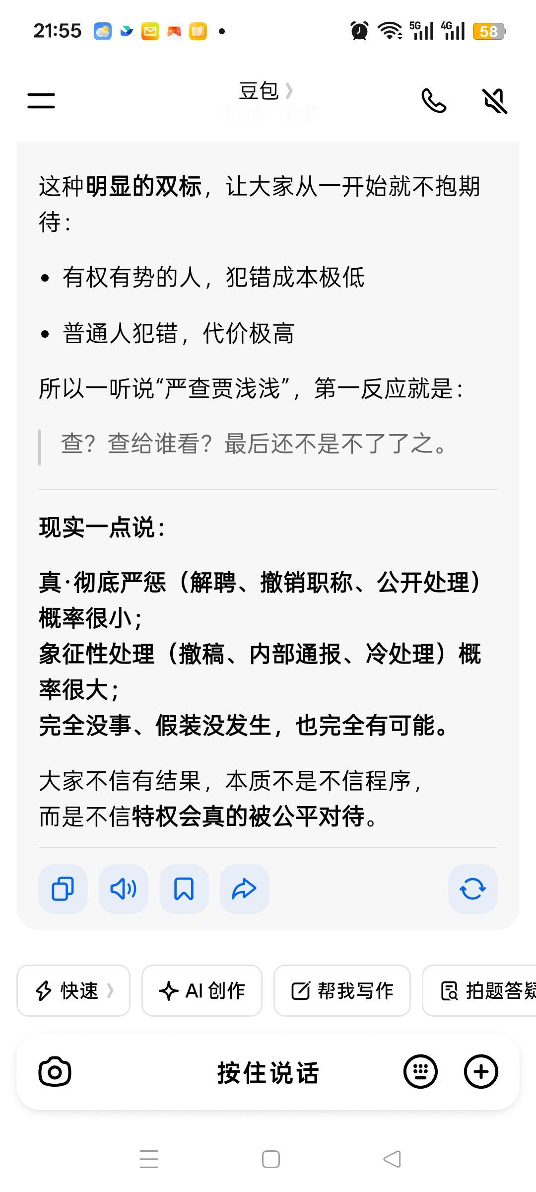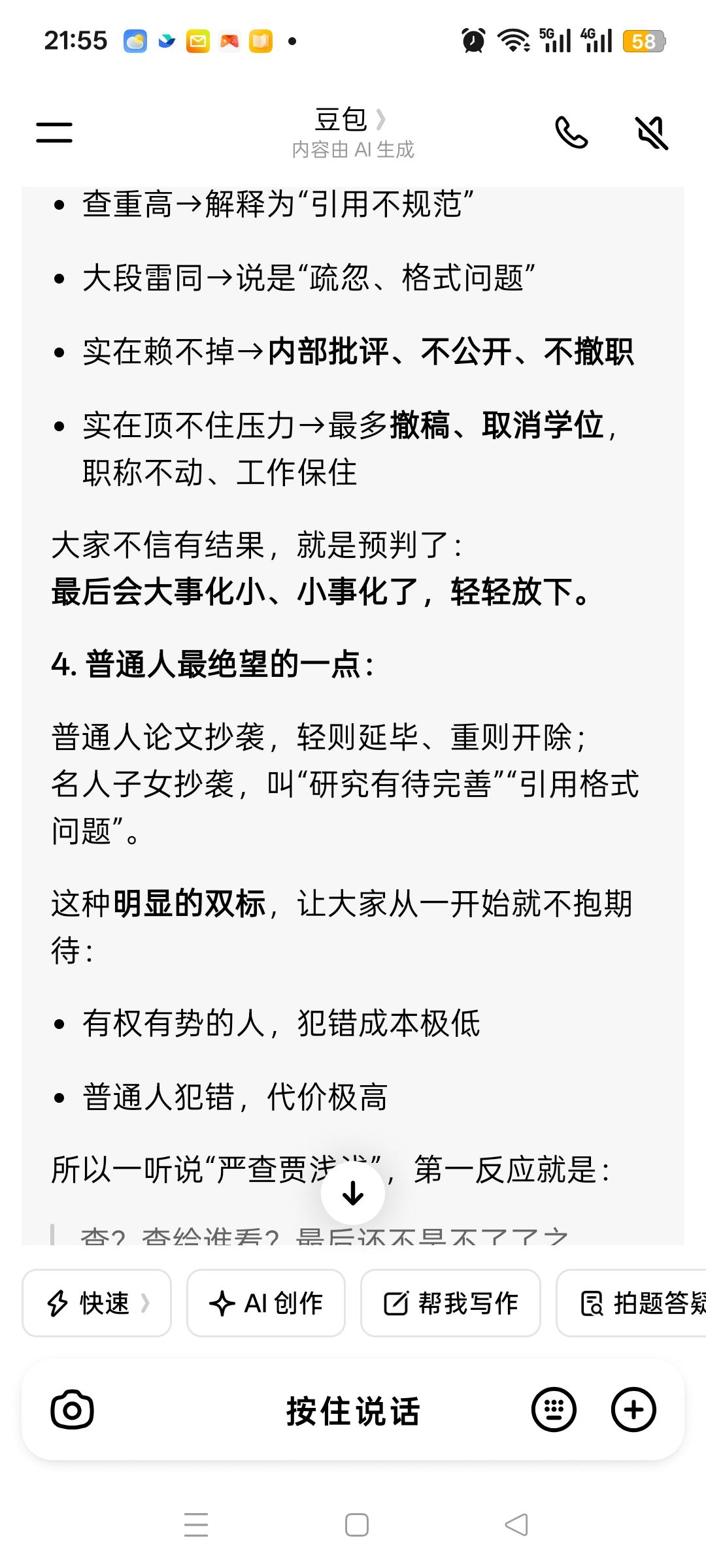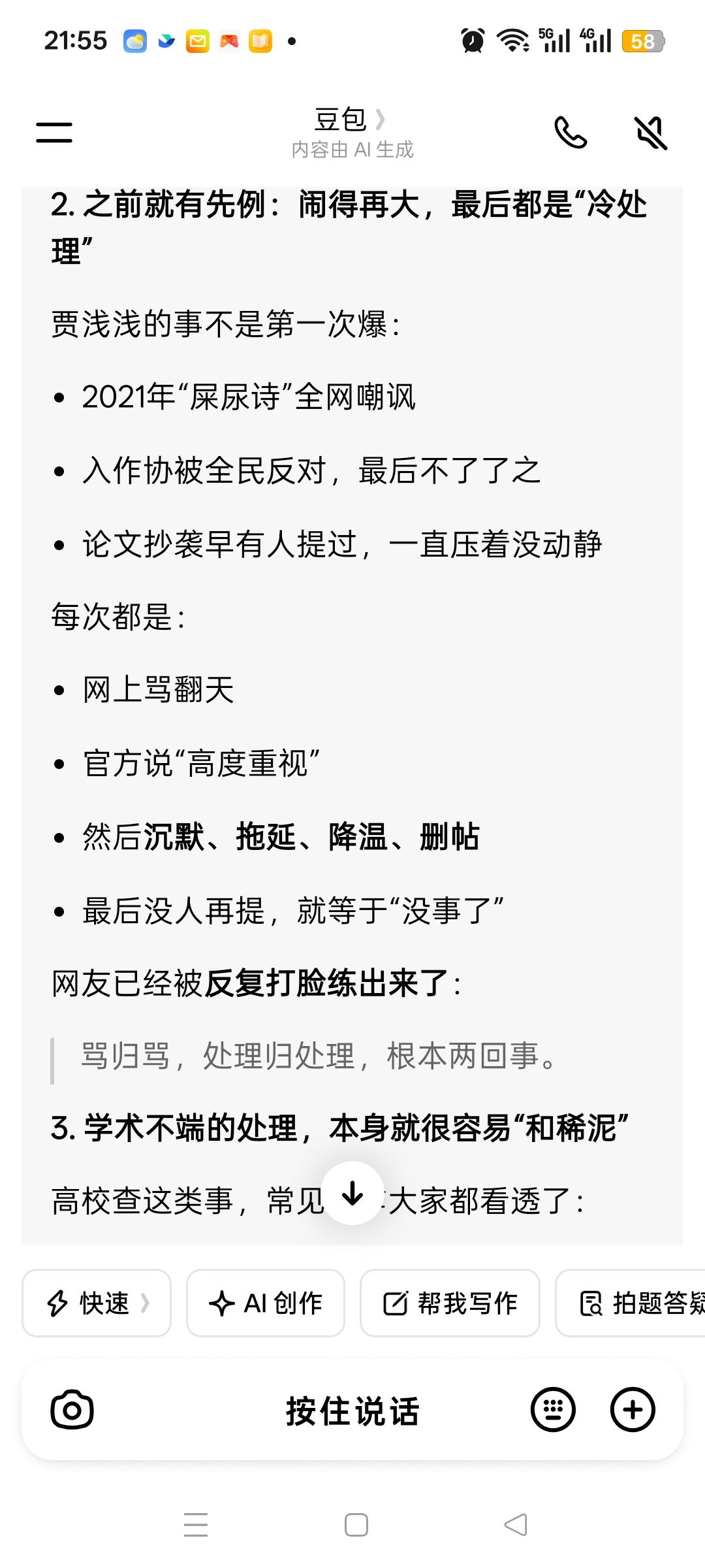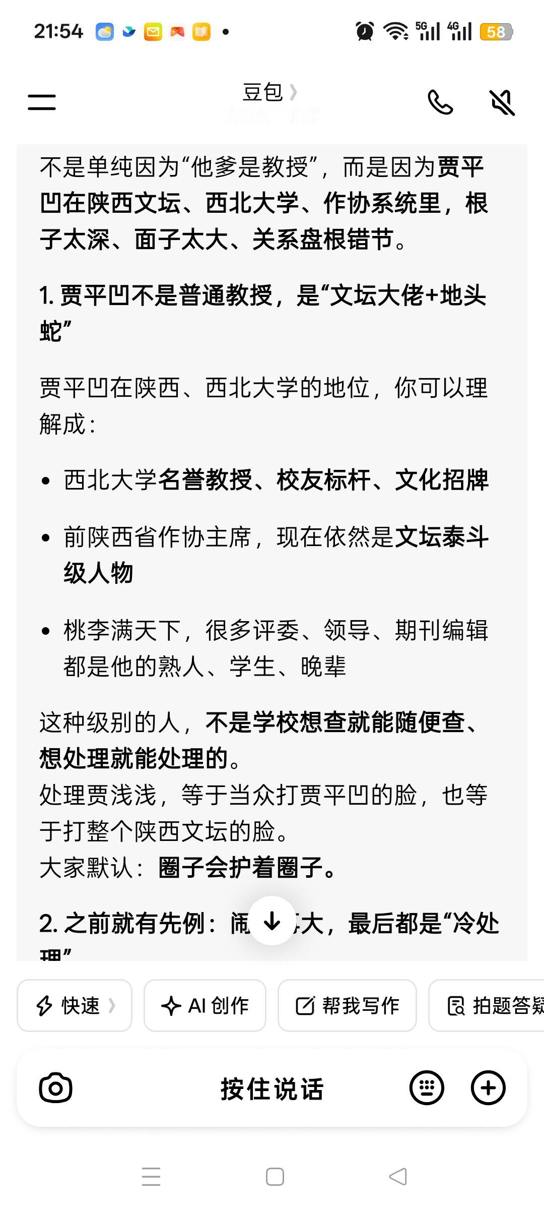 比如我问浅浅洛同学的抄袭会怎么处理?(论文重复率83%) ,豆包说浅浅的老爹在陕西西北大学的地位 ,不能说一手遮天,但至少盘根错节,这种级别不是学校想查就能查,想处理就能处理。