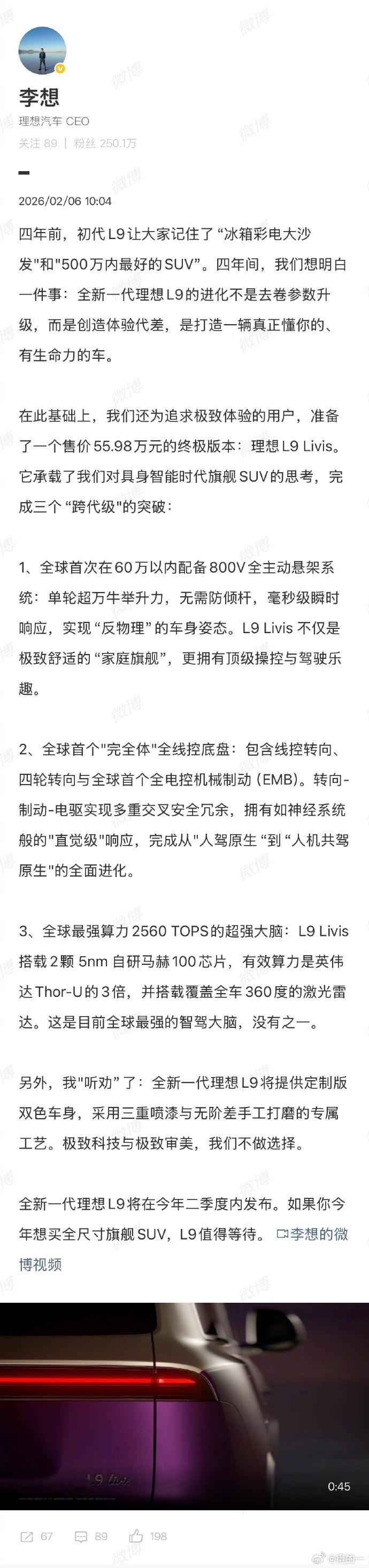 【全新一代理想L9 Livis:智能与底盘的双重进化】全新一代理想L9 Livis实车近日曝光并开启预售。新车在智能化上实现跨越,首发搭载双颗5nm制程自研马赫100芯片,总算力高达2560TOPS,为高阶智驾提供强大算力底座。感知硬件方面,配备4颗激光雷达实现360度全覆盖,并启用UWB技术取代传统雷达,实现车身无开孔设计。性能层面,新车迎来底盘技术革命。全系标配800V全主动悬架与全线控底盘,集成线控转向、四轮转向及全电控机械制动。该系统可主动调节车身姿态,精准抑制侧倾与俯仰,配合多重安全冗余设计,实现了从“车适应路面”到“悬架驯服路面”的质变。外观设计上,新车整体线条更显圆润,首次引入双色车漆,配合简约封闭式前脸,视觉效果更具旗舰质感。总的来说期待李想同学的大活吧理想 l9livis
