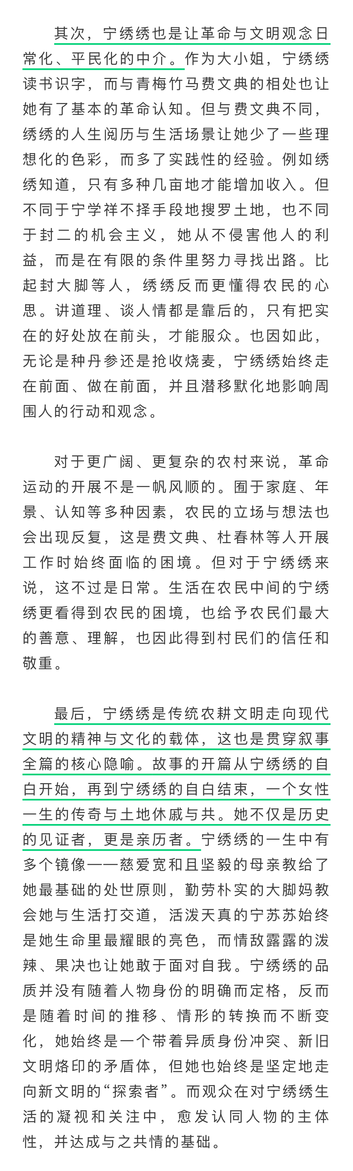 从市场反馈和观众评价来看,《生万物》中的宁绣绣是整部作品最具标志性的人物,也是最典型的隐喻物象。她是集合了所有矛盾冲突的核心人物,也是传达核心价值观念的重要载体。①宁绣绣是沟通先进与传统生产经验、劳作模式的桥梁。②宁绣绣也是让革命与文明观念日常化、平民化的中介。③宁绣绣是传统农耕文明走向现代文明的精神与文化的载体,这也是贯穿叙事全篇的核心隐喻。故事的开篇从宁绣绣的自白开始,再到宁绣绣的自白结束,一个女性一生的传奇与土地休戚与共。她不仅是历史的见证者,更是亲历者。