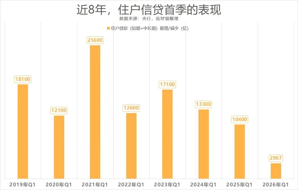 另一边的信贷数据令人扎心,一季度住户新增贷款连3000亿都没有,只有2967亿。这个数字的概念,看看之前7年就知道什么程度。之前最低的是去年一季度的10400亿,今年居然连去年同期的1/3都没有,可见大家贷款花钱的动力几乎被冷冻了。