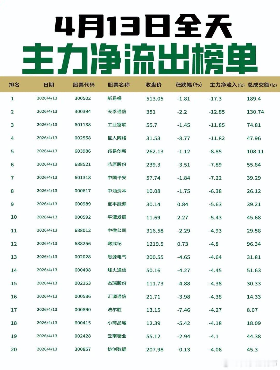 【4月13日全天主力净流入流出榜单出炉🔥】: 今日全天主力资金流入PCB、玻纤及新能源材料方向。兴森科技获22.09亿元净流入居首,中国巨石、天华新能、胜宏科技等获资金抢筹;二六三、华工科技、浪潮信息等科技股同步活跃。流出榜上,光模块及游戏板块承压,新易盛遭17.3亿元抛售,天孚通信、工业富联、巨人网络、兆易创新等资金流出居前。市场分化延续,资金从高位光模块切换至低位PCB及材料方向。