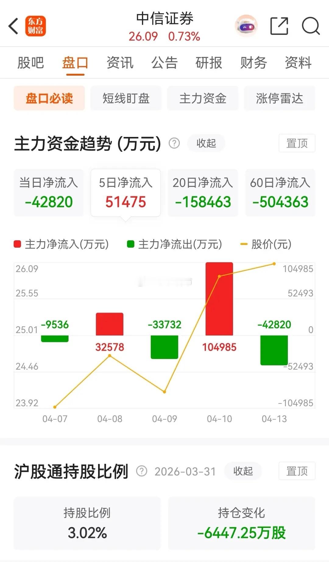 券商一哥中信证券,今天的走势同东方财富一样,低开冲高回落后在均价线上方震荡整理,涨了0.73%,报价为26.09元。在资金流向上,今天同样也是被主力资金小幅净卖出了4.2820亿元,近五个交易日则是被主力资金合计净买入了约5.1475亿元。从走势上看,继续保持着向上反弹的态势。至于更详细的技术分析,可以查看上一篇中关于券商概念板块走势的分析。