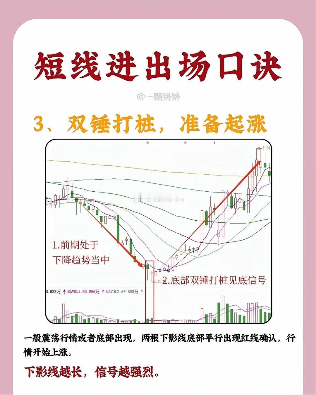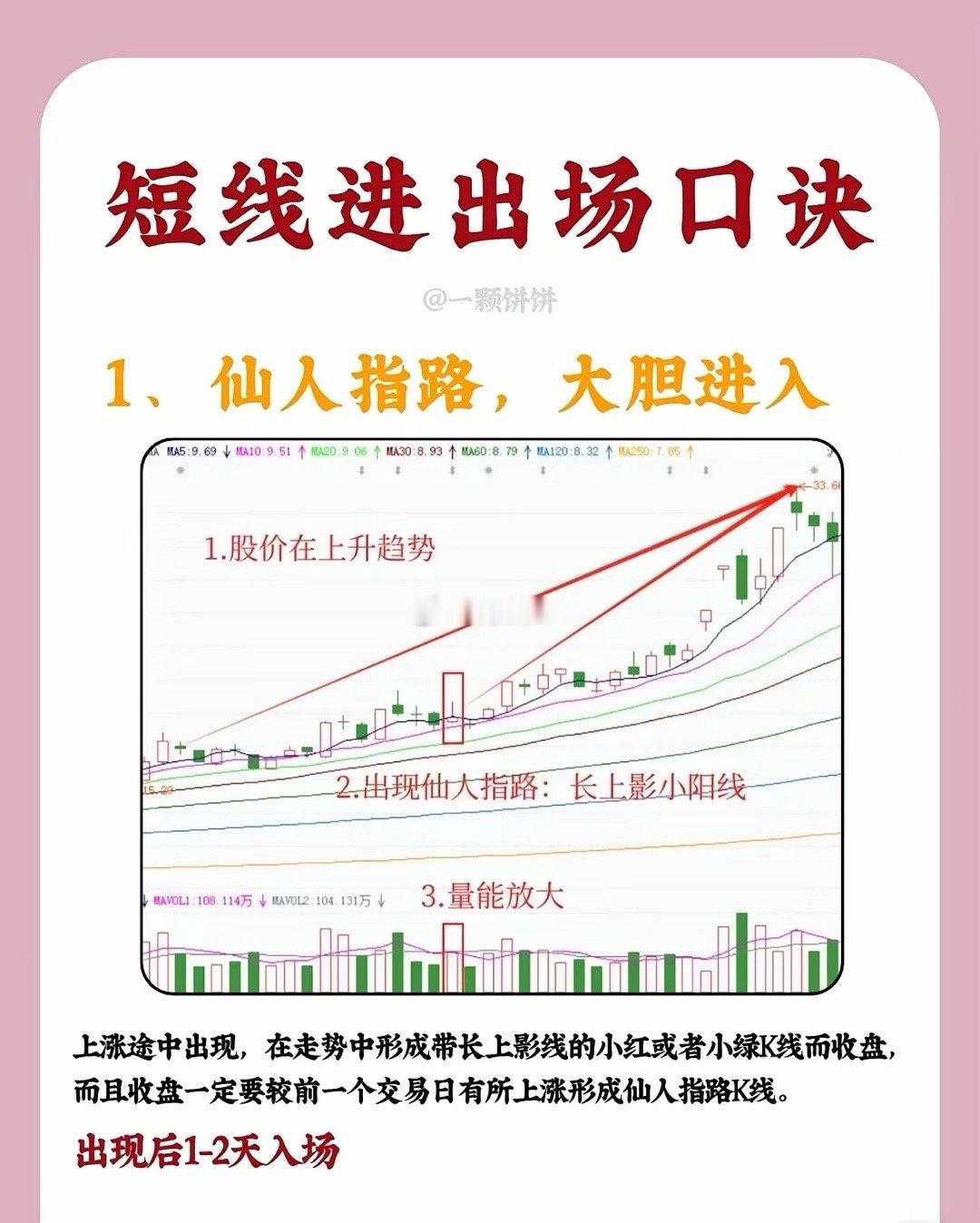 短线进出场口诀1、仙人指路,大胆进入股价处于上升趋势中时,若出现带长上影线的小阳线或小阴线(即“仙人指路”K线),且当日收盘价较前一日上涨、成交量明显放大,说明多头尝试向上突破后虽有回落,但承接力较强。该形态出现后,1 - 2个交易日内可择机入场,后续往往延续升势。2、高位吊线,小心吃面当股价在高位冲高回落,收出上影线极长、实体极小的K线(类似“吊颈线”),且成交量显著放大,同时后续反弹时无法突破该长上影线的顶端,这通常是见顶信号。次日K线往往低开低走,需及时止盈或止损,防范下跌风险(“吃面”即亏损)。3、双锤打桩,准备起涨若股价前期处于下降趋势或震荡行情中,底部区域出现两根下影线平行、底部价位相近的K线(即“双锤打桩”),且随后出现阳线确认,说明下方支撑强劲,多头开始发力。下影线越长,底部信号越强烈,后续行情大概率启动上涨。4、双峰触天,跌在眼前股价上涨至高位时,若出现两根(或多根)上影线平行、顶部价位相近的K线(即“双峰触天”),且出现阴线确认、成交量放大,意味着上方抛压沉重,多头无力突破,行情将转为下跌,需果断离场规避风险。(注:技术形态需结合大盘环境、个股基本面综合判断,请勿单一依赖口诀操作。)