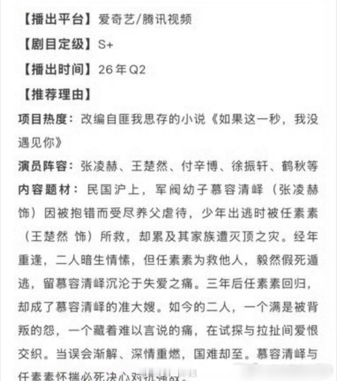 张凌赫跟王楚然主演的《这一秒过火》直接开启招商模式了呢,民国时期的爱恨情仇啊,不