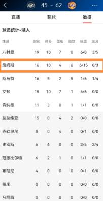 事实上,上半场詹姆斯首发出战16分钟,投篮15中6,命中率刚过4成,确实不算出色,其中三分球3中0,没投进一个外线,罚球7中6,最终拿到18分4篮板6助攻3抢断,还有4次失误,场上正负值是+14。