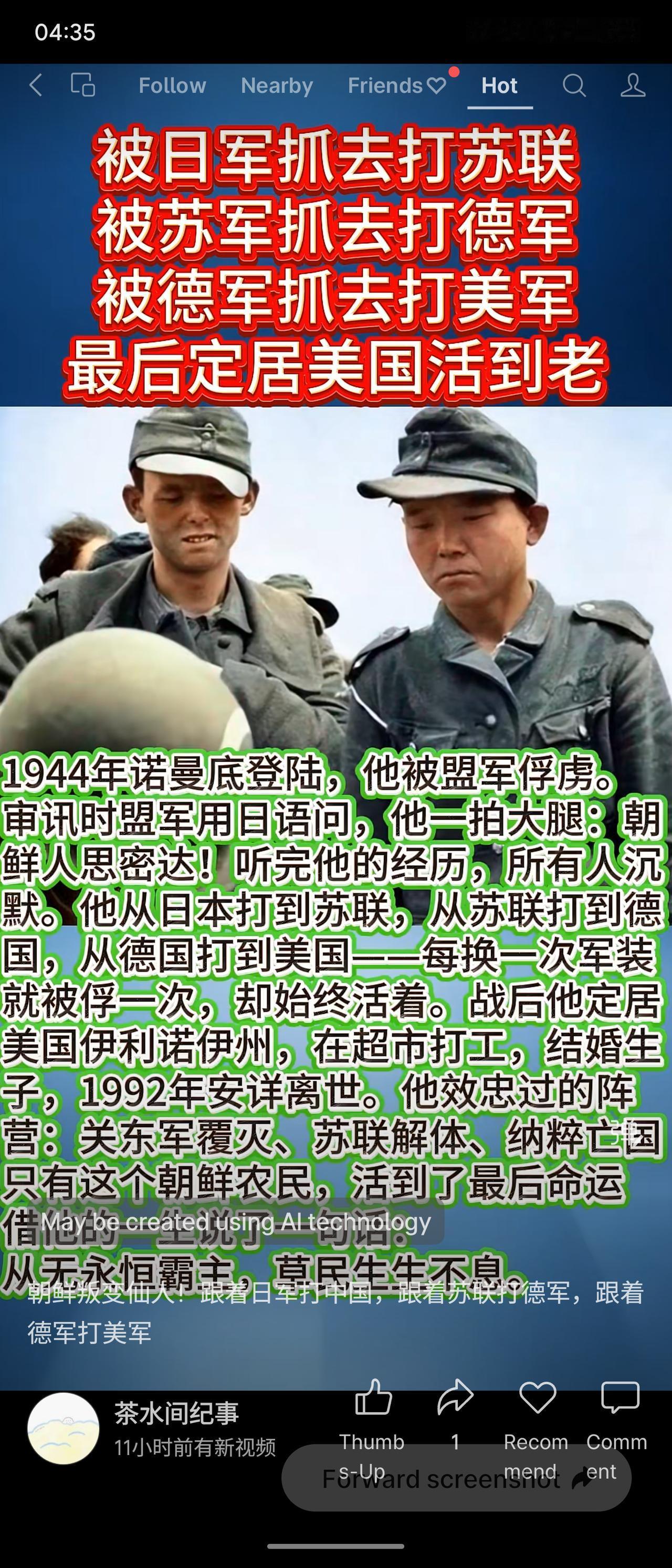 这是一个朝鲜农民杨景钟的传奇经历:1938年被日军抓去诺门罕打苏联,被俘后编入苏军惩戒营打德军,又被德军俘虏后送往法国驻防,最终在诺门罕登陆中被美军俘虏。战后定居美国,活到1992年。他被迫辗转于日、苏、德、美军中,每次都奇迹生还。这段经历折射出小人物在世界大战洪流中的无奈与顽强,也讽刺了阵营更迭下个体命运的荒诞——他没有背叛,只是被历史裹挟着活到最后。