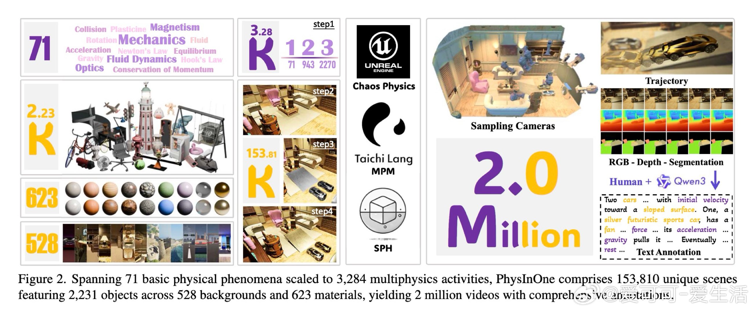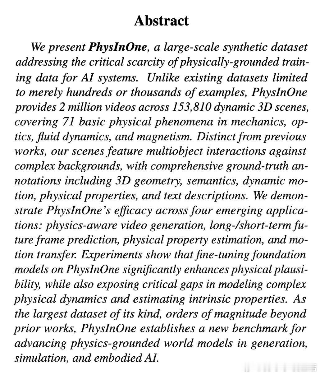 在视频生成与物理推理领域,AI模型普遍缺乏真正理解物理规律的能力——生成的视频中物体会向上坠落、速度无故突变。根本原因在于:现有训练数据最多仅涵盖数千个样本,且局限于简化场景与单一物理现象,无法为模型提供学习真实物理世界所需的规模与多样性。