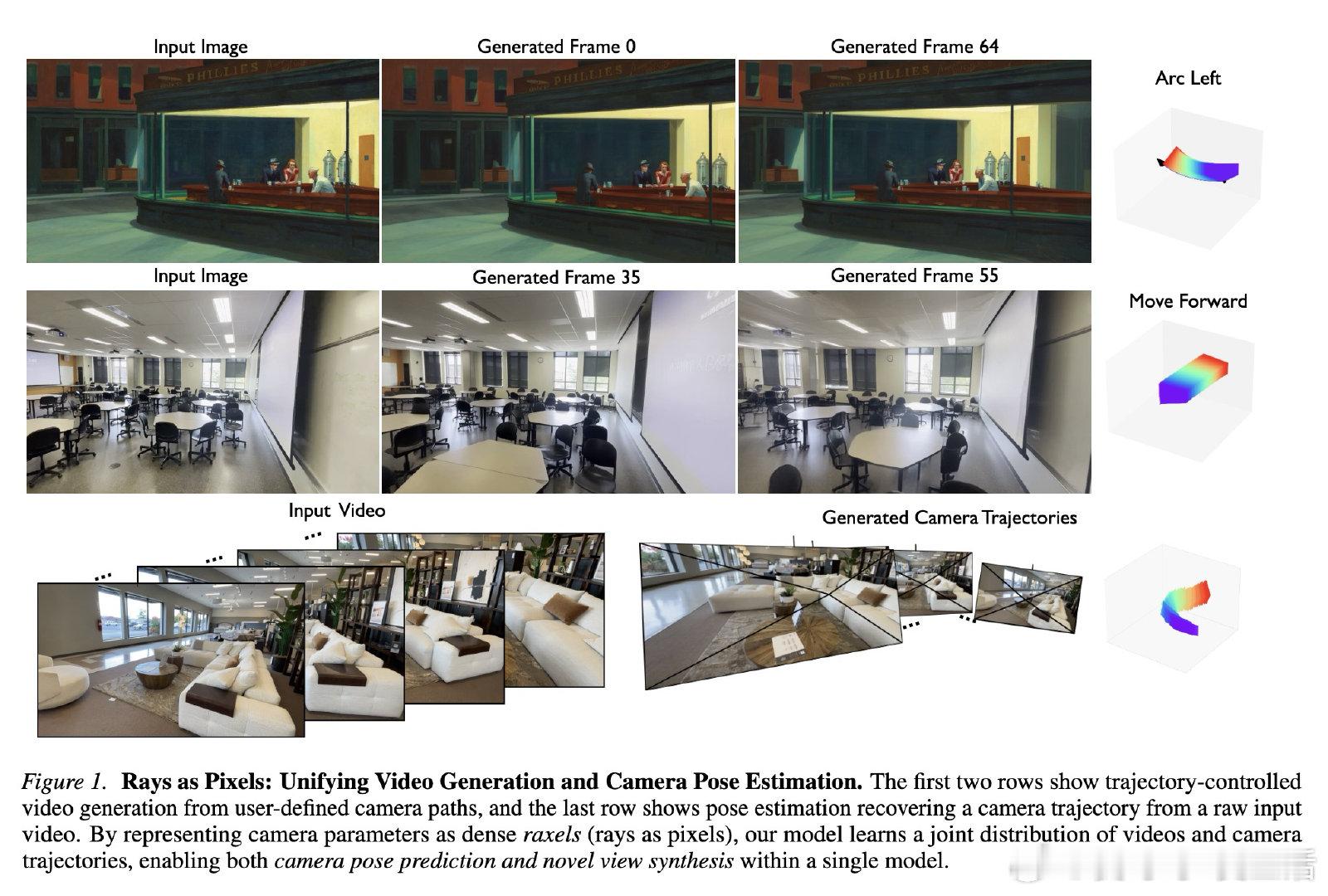本文的核心洞见是:把相机参数重新看作一种"可以被图像编码器处理的像素"。将每条相机光线的方向与原点叠加为三通道图像(raxels),使相机轨迹与视频帧共享同一个VAE潜空间;由此,单一扩散模型得以同时对视频和相机轨迹去噪,解锁了正向(给定轨迹生成视频)与逆向(从视频恢复轨迹)两种推断路径的联合建模。