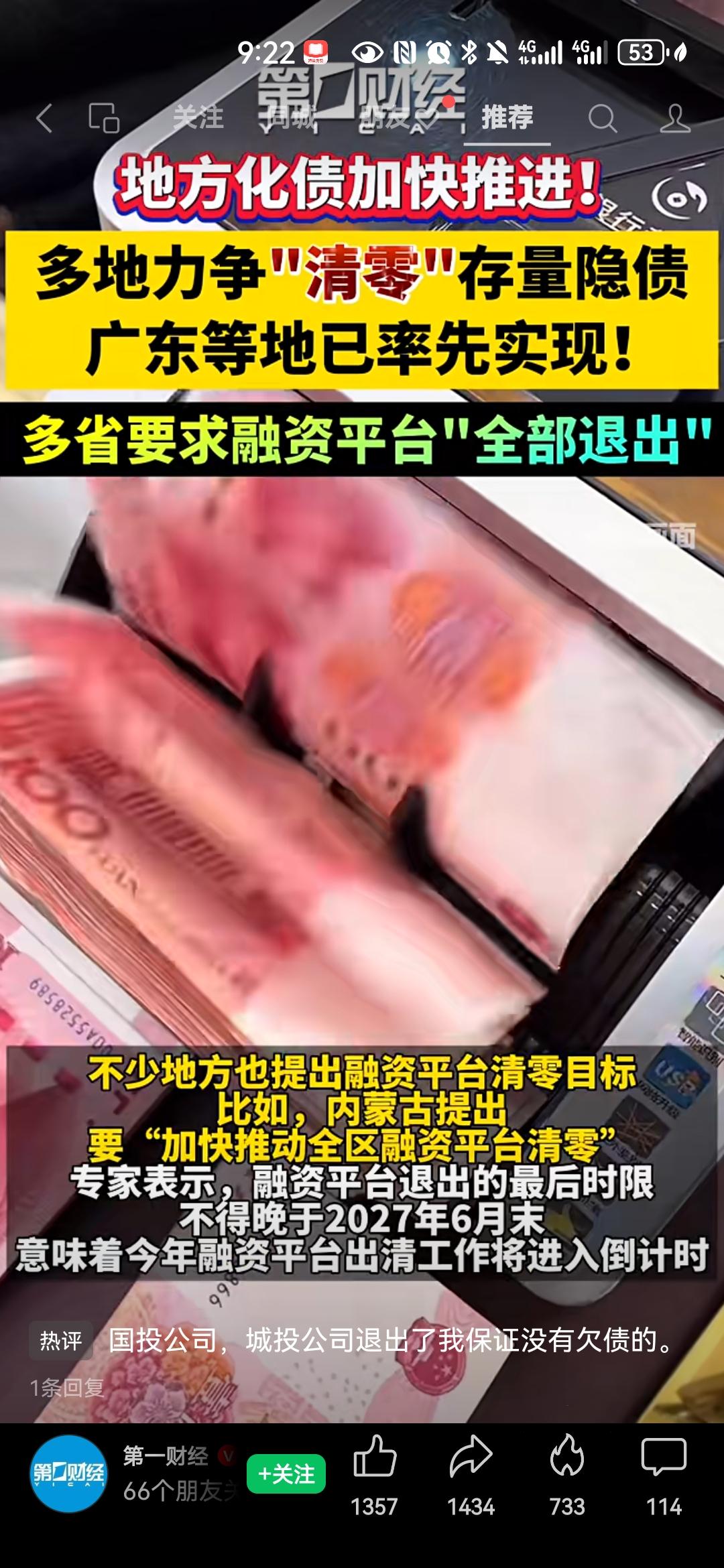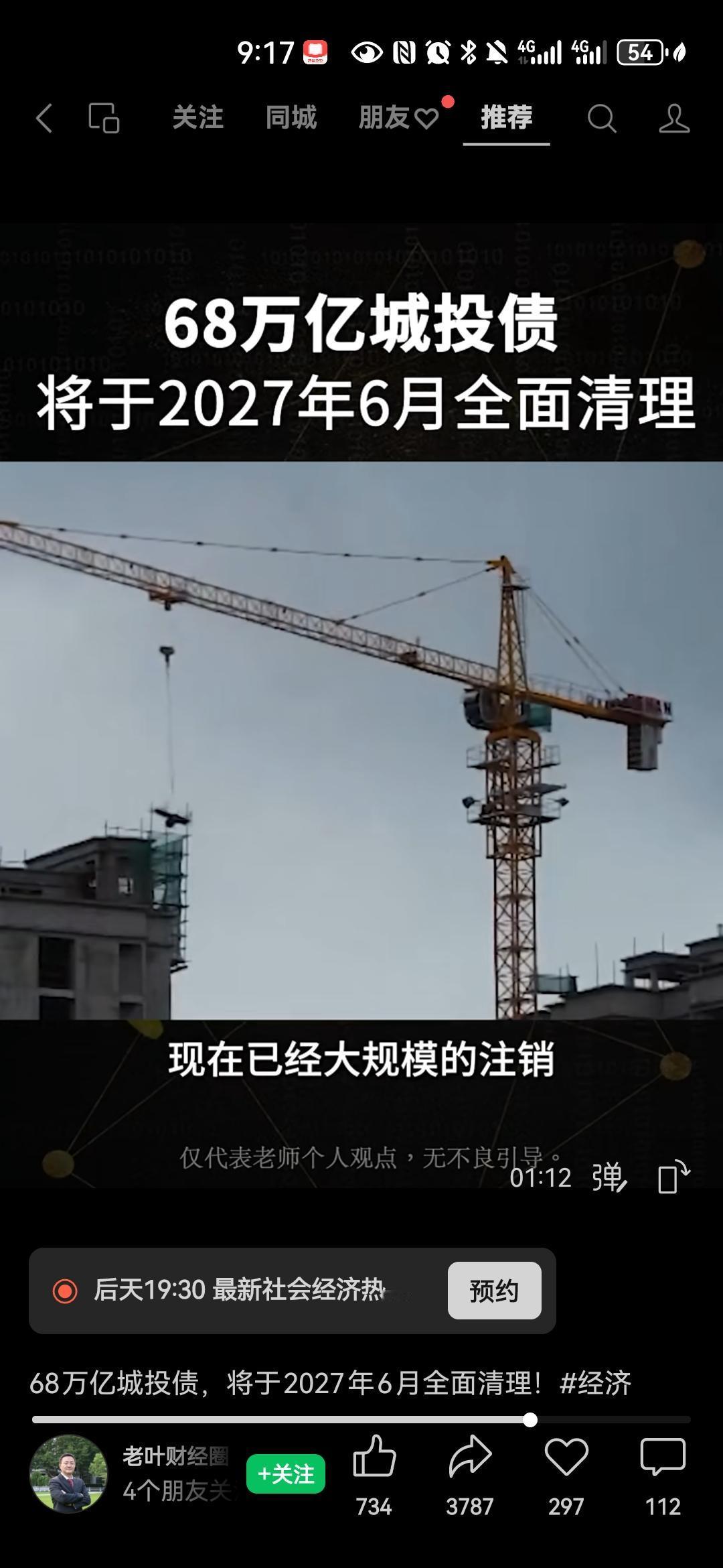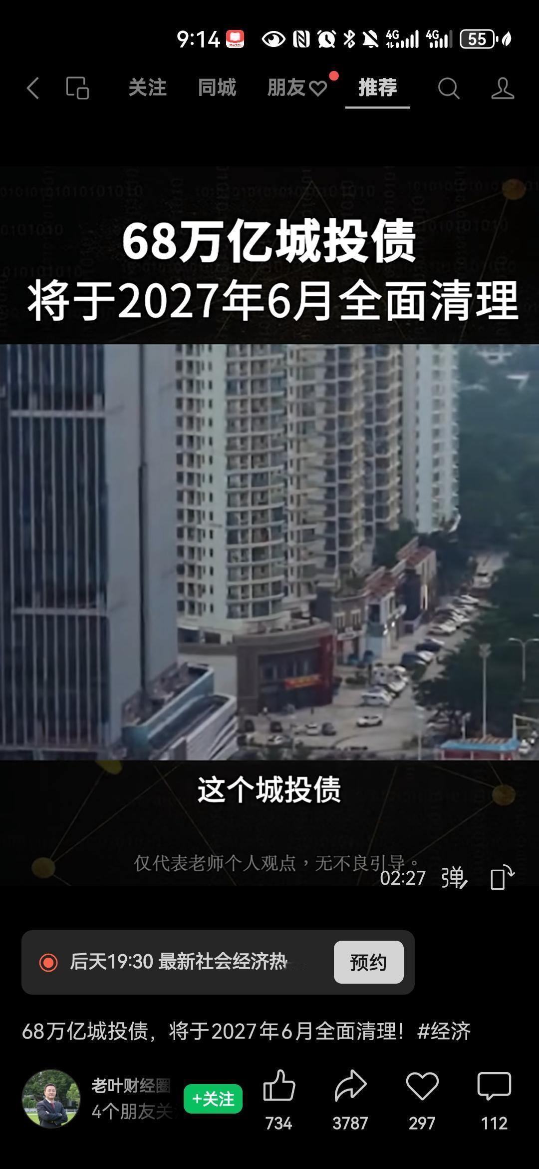 这两天城投化债新闻太劲爆了,有几个数字很敏感:一是68万亿地方城投债相当于中国一年国内生产总值的一半。二是一年利息3.5万亿相当于要卖中国5-6个月的房子。三是2027年6月要全面清理相当于14个月要把债务逾期问题解决。