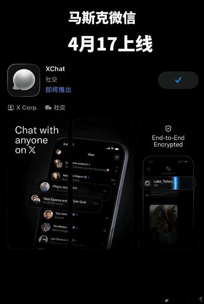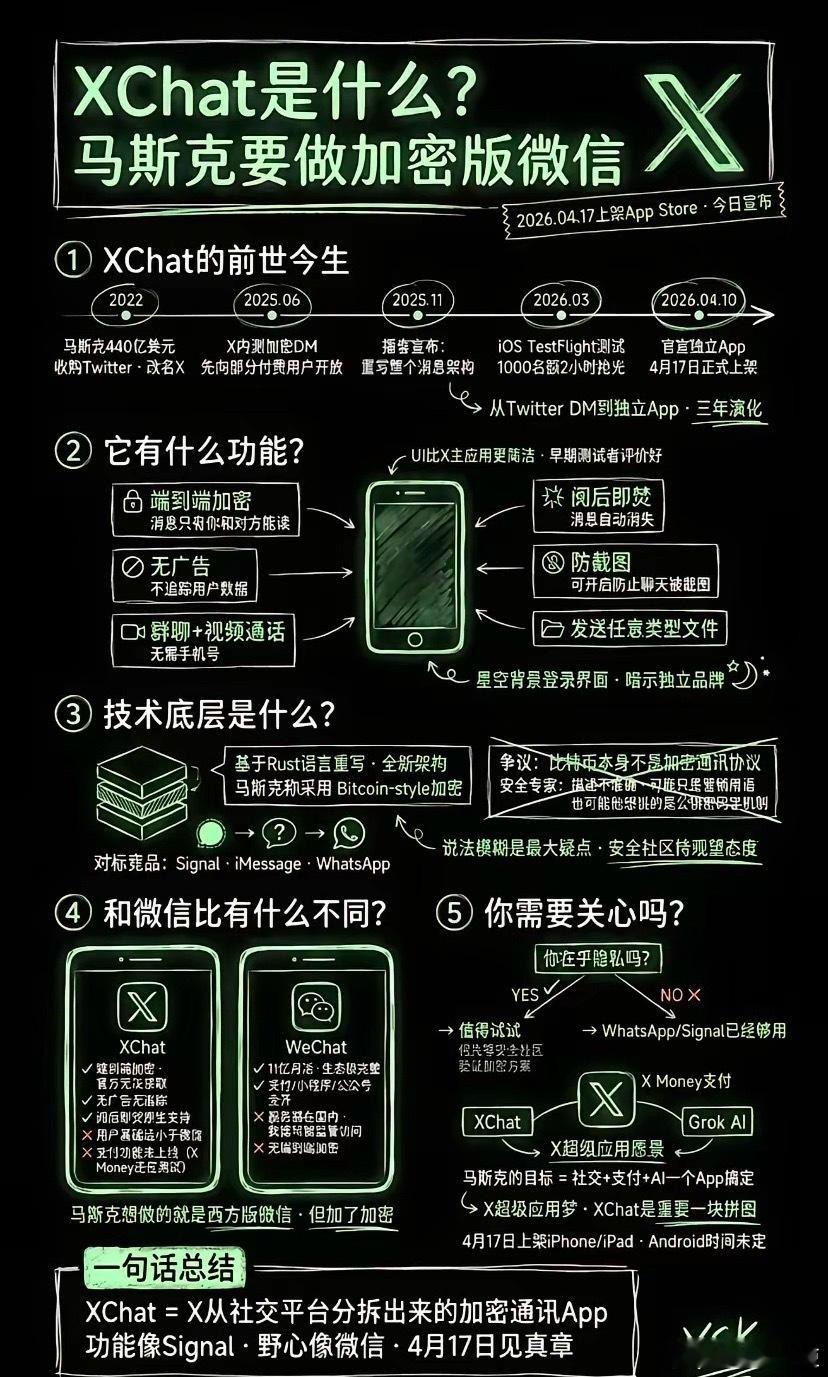 马斯克放大招了,黑色微信要出来了,号称“微信杀手”。网传马斯克的Xchat将于4月17号上线,相比我们的绿泡泡微信,他多了“端到端加密、无广告、阅后即焚和防截图”的功能。网友们看完后纷纷喊话:要不是工作需要微信群 ,不然微信我都随时卸载。我用微信是因为微信支付,他这个能付钱的话也可以试试。不可能取代微信的,微信用户基数太大了……个人认为,Xchat再强,它想彻底取代微信,基本不可能。微信的用户量太大了,身边所有人、工作、生活都绑在上面,迁移成本太高,大多数人根本没法换。那么,到时候你会下载Xchat体验一下吗?
