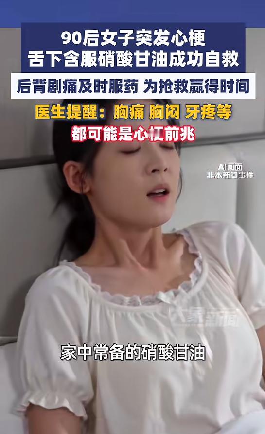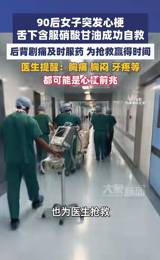 信息来源:《90后女子突发心梗,舌下含服硝酸甘油成功自救,医生提醒:胸痛 胸闷 牙疼等都可能是心梗前兆》——大象新闻