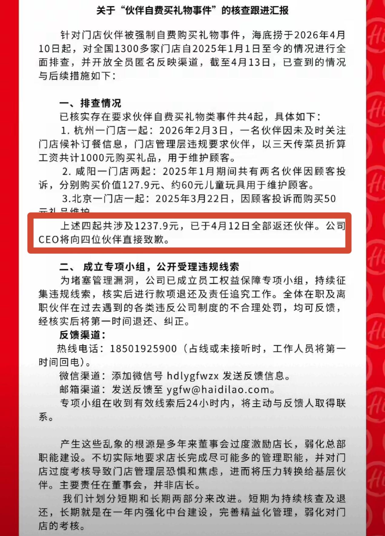 风口浪尖的海底捞表示,这四起“员工遭强迫自费购买礼物赔客人”的案例涉及的款项,已经全部返还给员工。海底捞创始人、现任CEO张勇将向四名员工致歉。