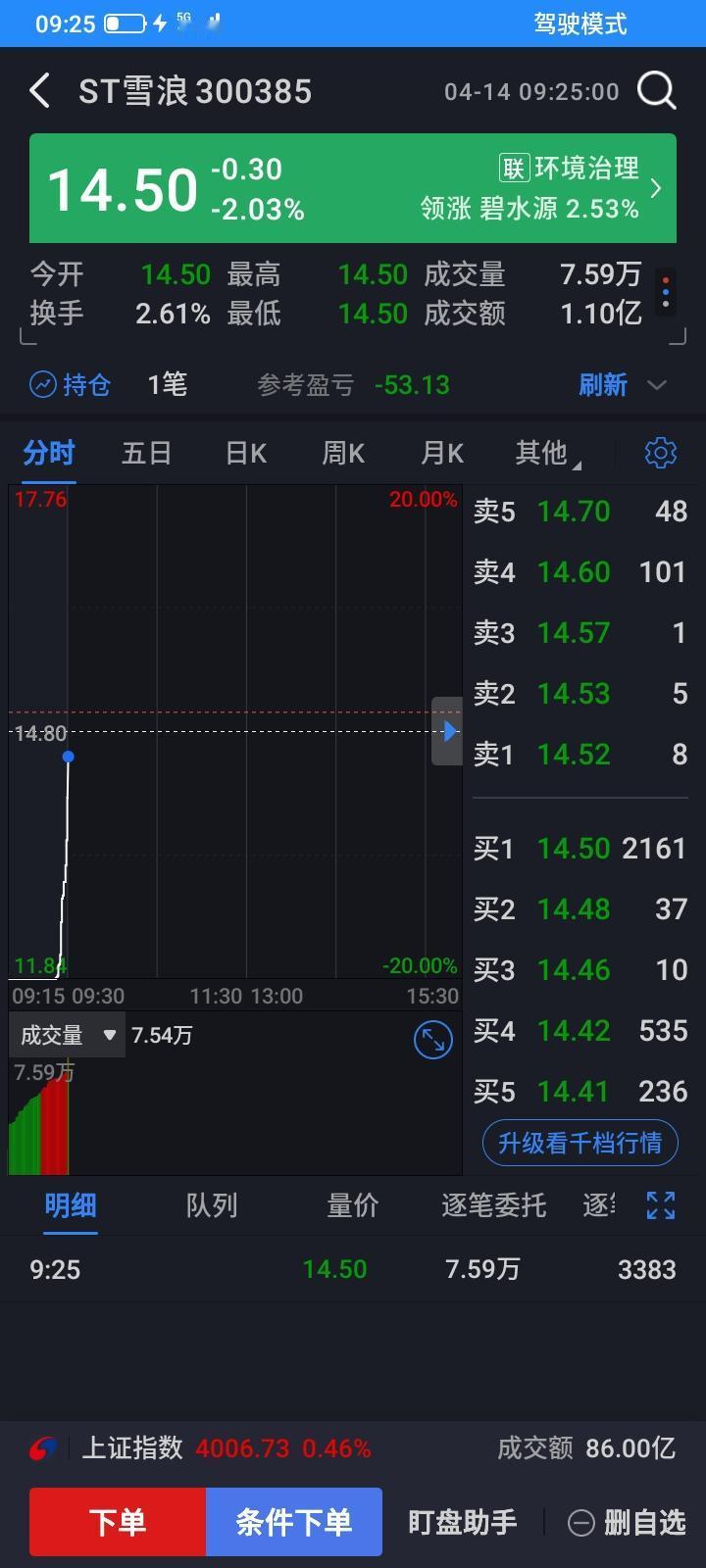 前两天雪浪环境又出公告,被st了,昨天停牌一天,问了豆包,保守估计两三个跌停,但是今天开盘了,并没有太恐慌,开盘几万手愿意跌停卖出而已,还被主力拉起来了,开盘只是小幅下跌而已,松了一口气,看来不会几个跌停了,逃过一劫吧。今天就算下跌,也不至于几个跌停了吧,老天保佑呀。