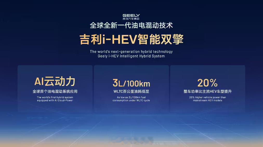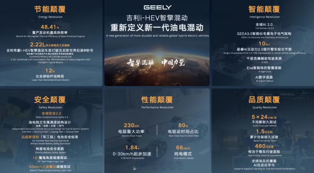 吉利i-HEV智擎混动 吉利全新一代油电混动技术吉尼斯世界纪录认证的油电混动车百公里综合工况油耗——2.22L发动机热效率更是达到惊人48.41%,一样保持全球第一