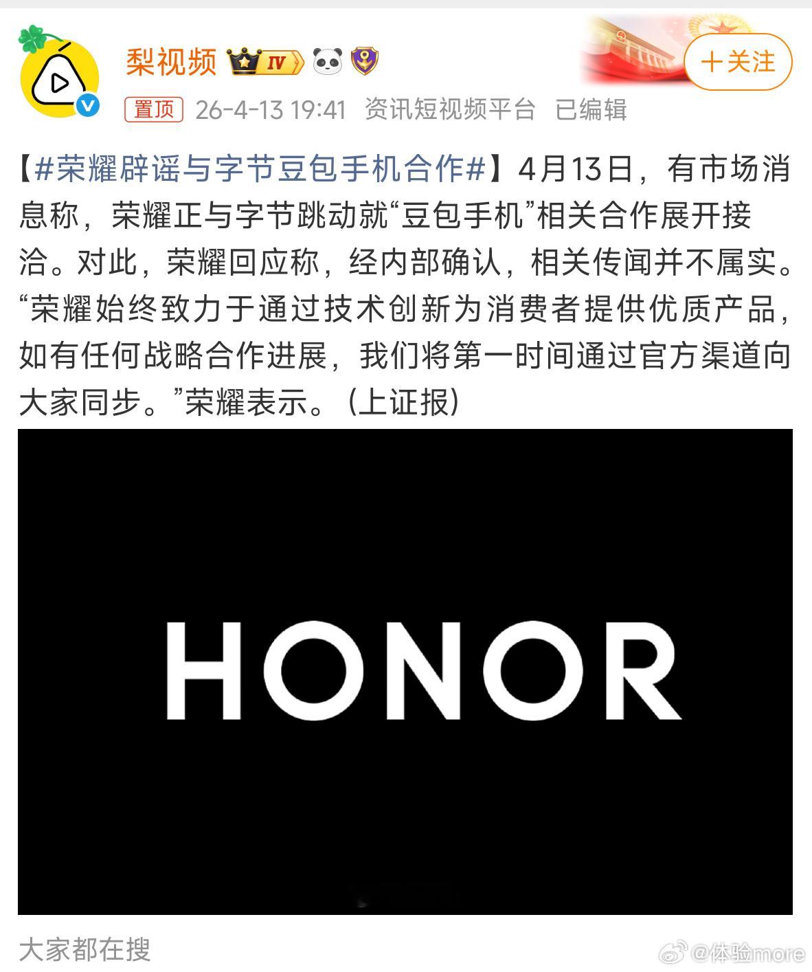 荣耀否认与字节就豆包手机接洽合作早上被报道,晚上就否认了。